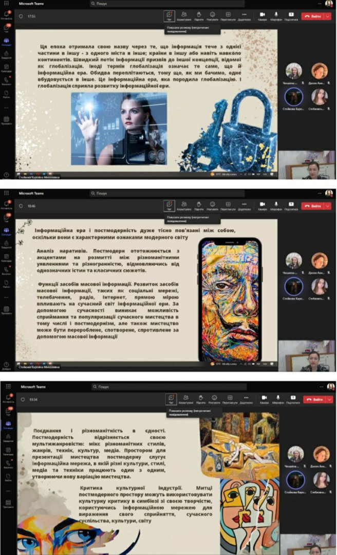 30 червня 2023 року відбулося підсумкове засідання гуртка «Південноукраїнські наукові студії», секція «Менеджмент СКД: теорія, історія та перспективи розвитку в Україні» (керівник – проф. Петінова О. Б.). Обговорювали питання транснаціонального проєктування в інформаційному просторі та особливості презентації мистецтв інформаційної доби. Здобувачі першого (бакалаврського) рівня вищої освіти 2-го року навчання ОПП «Менеджмент соціокультурної діяльності» Марія Чекаліна та Кароліна Стойкова підготували яскраві презентації, всі охоче брали участь у дискусії та обговоренні, наводили власні приклади та висловлювали свою точку зору щодо проблем, які розглядалися.