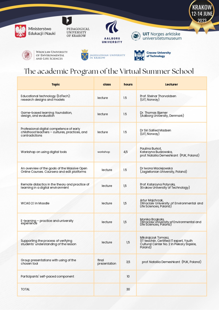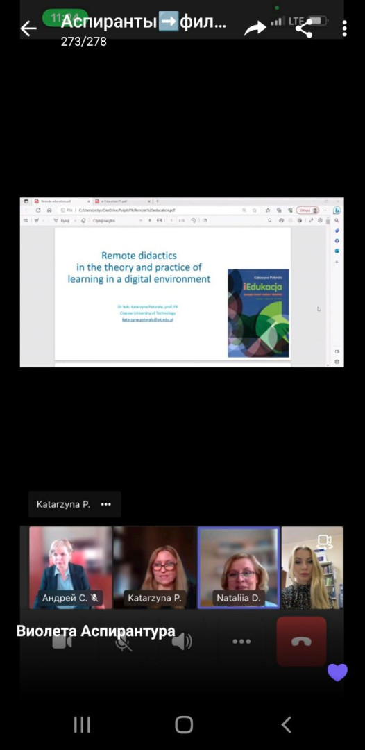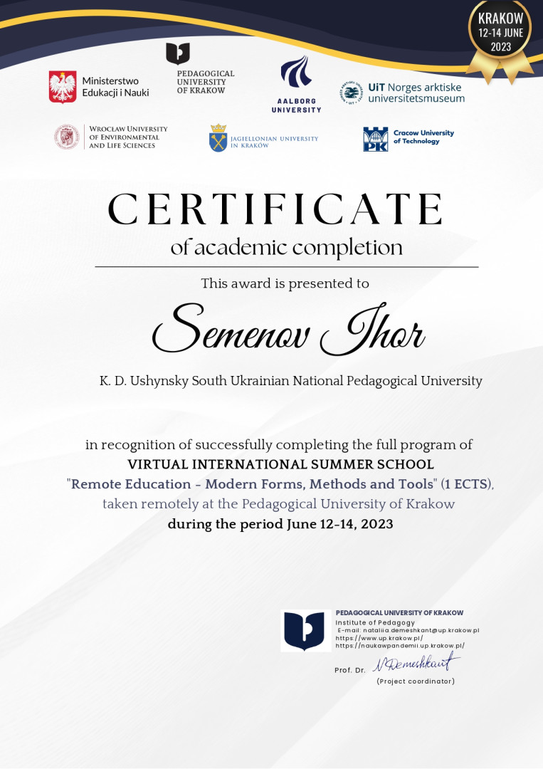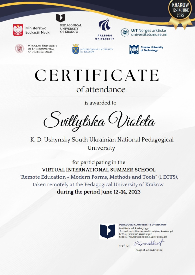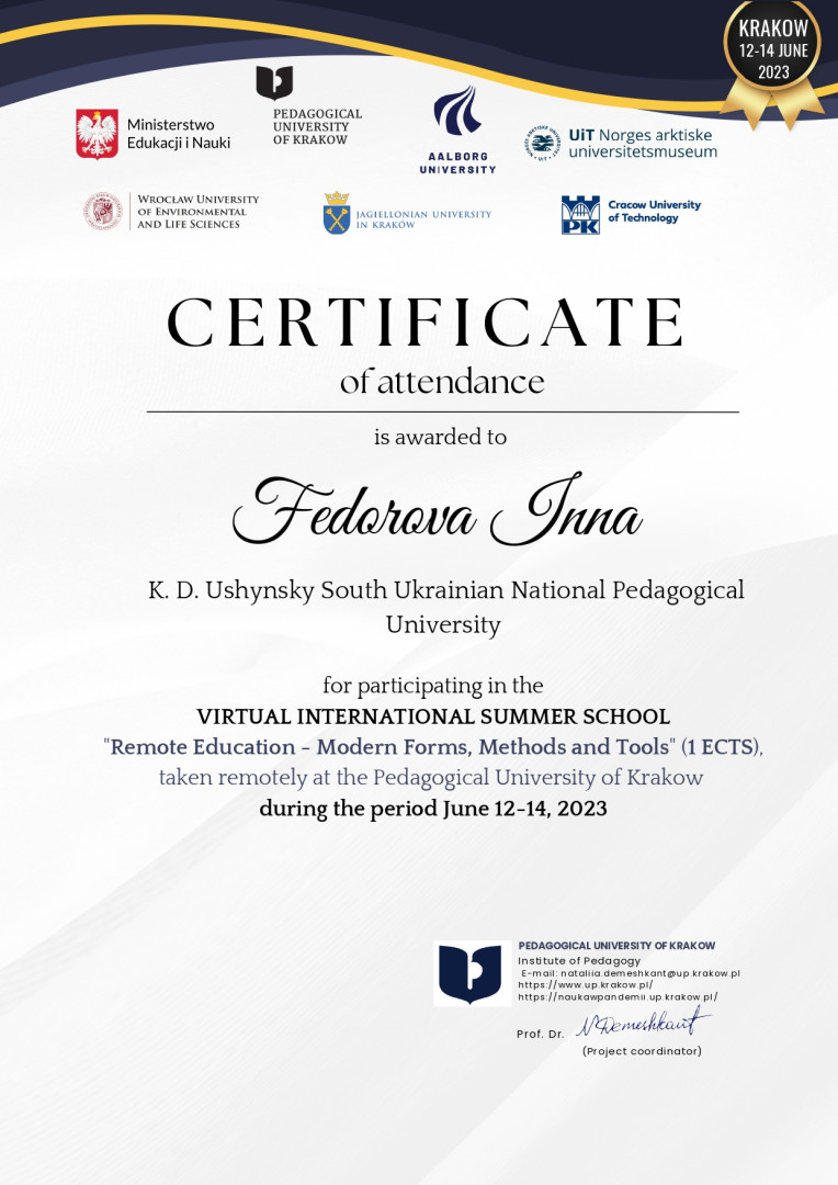 У червні 2023 року здобувачі третього (освітньо-наукового) рівня вищої освіти ОНП «Філософія» (Марина Арапакі, Віолета Світлицька, Інна Федорова, Елеонора Бутенко та інші) пройшли онлайн теоретико-методологічне й практичне навчання у віртуальній літній міжнародній школі за програмою «Remote Education – Modern Forms, Methods and Tools» на базі Краківського педагогічного університету при підтримці партнерів – ЗВО Польщі, Данії та Норвегії, під час якого опановували цифрові інструменти, що використовуються під час організації освітнього процесу та, зокрема, дистанційного навчання.Приділено увагу історичному ретроспективному аналізу технічної підтримки освіти та датському ігровому досвіду навчання, проаналізовано дидактичні деталі та кращі міжнародні практики, представлено переваги Moodle та активних дистанційних інструментів, розглянуто освітні проєкти EdTech. Під час практичних занять учасники були поділені на групи для тестування цифрових інструментів та обговорення дидактичних питань, кожна група працювала над підготовкою групових презентацій. Серед спікерів – провідні НПП ЗВО: Pedagogical University of Krakow (Poland), UiT (Norway), Aalborg University (Denmark), Jagiellonian University (Poland), Krakow University of Technology (Poland), Wroclaw University of Environmental and Life Sciences (Poland). Програма сприяла набуттю здобувачами компетентностей та РН ОНП, зокрема, ЗК 03. Здатність працювати в міжнародному контексті; СК 04. Здатність здійснювати науково-педагогічну діяльність у вищій освіті; ПРН 07. Застосовувати сучасні інструменти і технології пошуку, оброблення та аналізу інформації; ПРН 09. Організовувати і здійснювати освітній процес, його наукове, навчально-методичне та нормативне забезпечення, застосувати ефективні методики викладання навчальних дисциплін, та ін. Чекаємо на отримання сертифікатів!