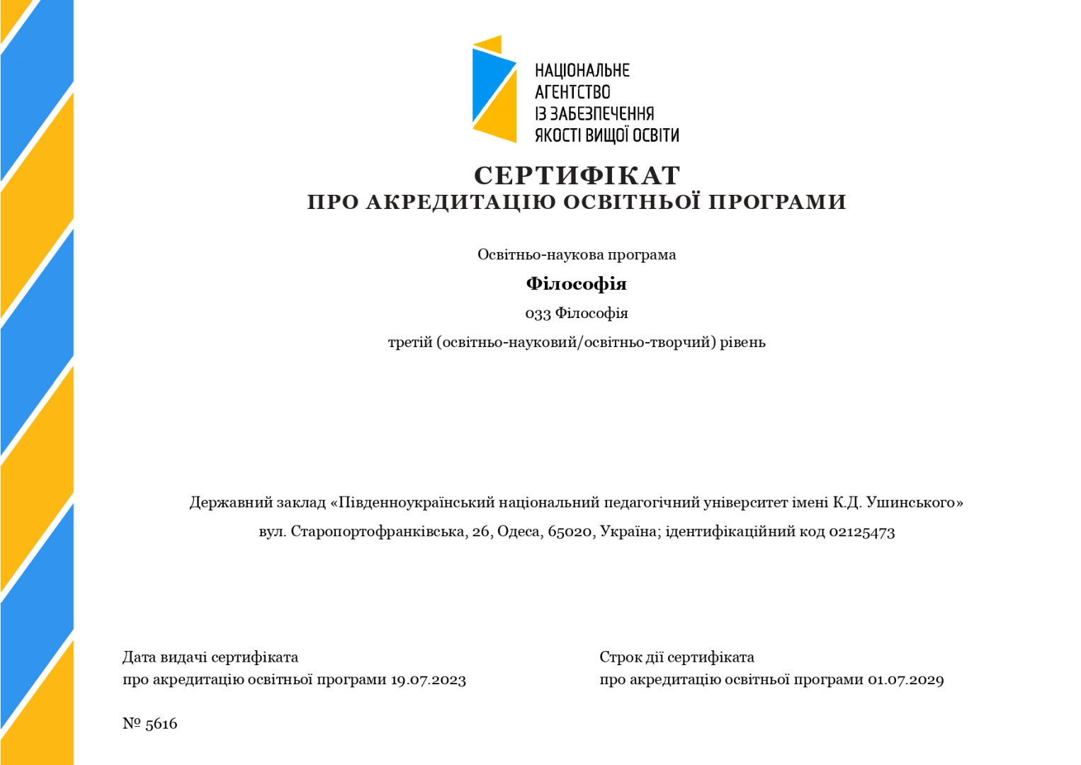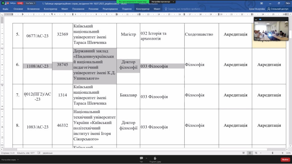 18 липня 2023 року відбулося засідання Національного агентства із забезпечення якості вищої освіти, на якому була розглянута акредитаційна справа 033 Філософія (доктор філософії) Університету Ушинського.
