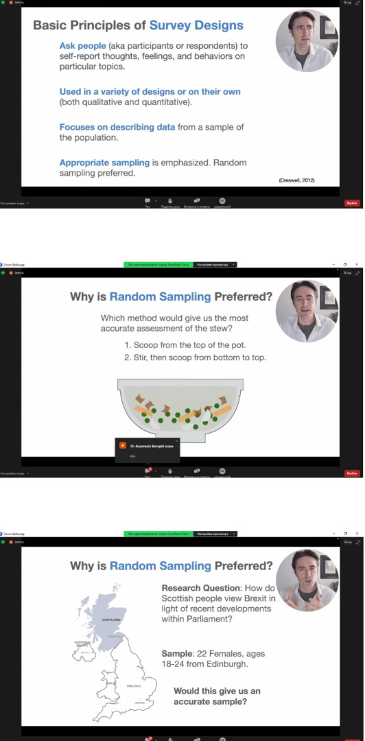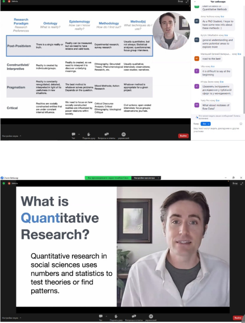 4 серпня 2023 року здобувачі третього (освітньо-наукового) рівня вищої освіти та гарант ОНП «Філософія» долучилися до онлайн лекції директора з питань освіти в Coursetune, старшого наукового співробітника Академії вищої освіти, засновника The Grad Academy Jonathan Cisco – «An Introduction to the Use of Quantitative Methods in Research in the United States».