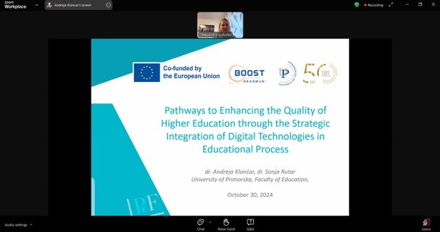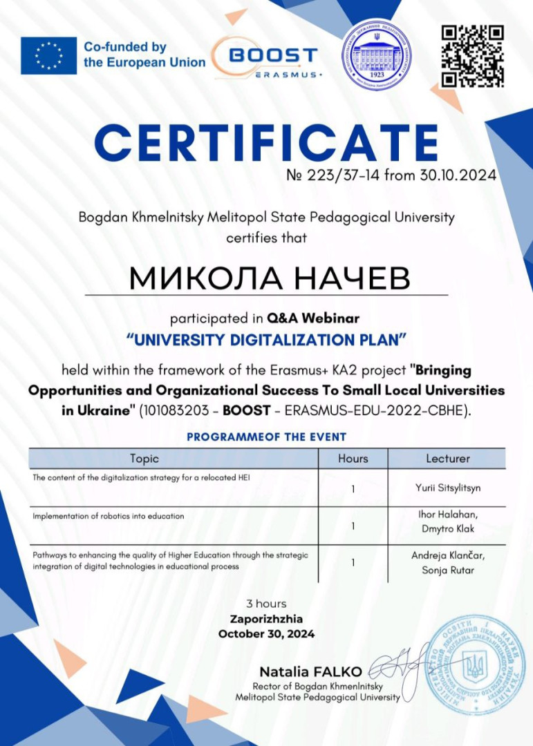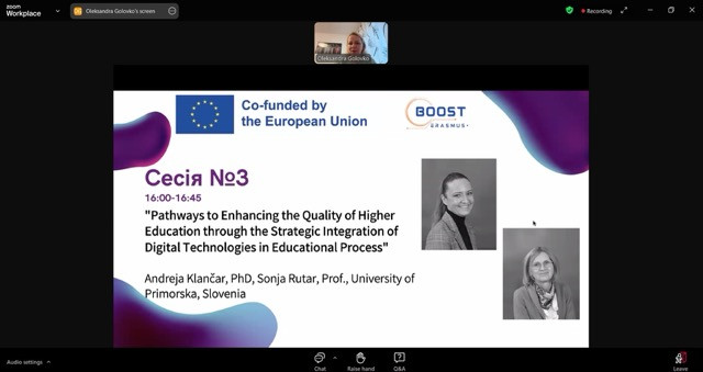Здобувачі третього (освітньо-наукового) рівня вищої освіти ОНП «Філософія» Микола Начев та Ігор Усатюк взяли участь у вебінарі «План диджиталізації університету», що проводився в межах імплементації Erasmus+ проєкту BOOST (Bringing Opportunities and Organizational Success To Small Local Universities in Ukraine). Мета заходу: ознайомитися зі здобутками європейських та українських університетів у сфері диджиталізації та розбудови цифрової інфраструктури сучасного університету; обговорити актуальні напрями цифровізації вищої освіти України в умовах війни. Активну участь аспіранти взяли в обговоренні лекції «Pathways to Enhancing the Quality of Higher Education through the Strategic Integration of Digital Technologies in Educational Process», Andreja Klančar, PhD, Sonja Rutar, Prof. (Приморський університет, Словенія).