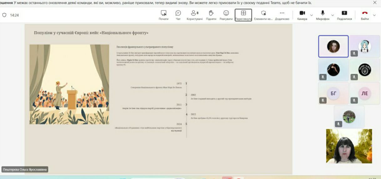 Учасники гуртка активно долучилися до обговорення актуальної проблеми: порівнювали державну політику, ідеологію, соціальну політику Д. Трампа, Дж. Мелоні, В. Орбана; описували сценарії зворотного демократичного транзиту; пропонували шляхи збереження і дієвого захисту демократій; аналізували ставлення до правих популістів в ЄС, наголошували, що не існує єдиного транснаціонального союзу правих популістів та визначили, що ставлення в ЄС до правих популістів залежить від їх дій стосовно збереження європейської унії.