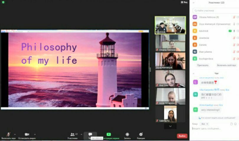 Під час заняття студенти мали змогу обмінятися думками та актуальною інформацію про розвиток сучасної філософії, презентувати власні розробки щодо сенсу життя та цінностей; поділилися особистими враженнями про студентське життя та навчання у ЗВО України та Китаю; поспілкувалися англійською та китайською мовами.