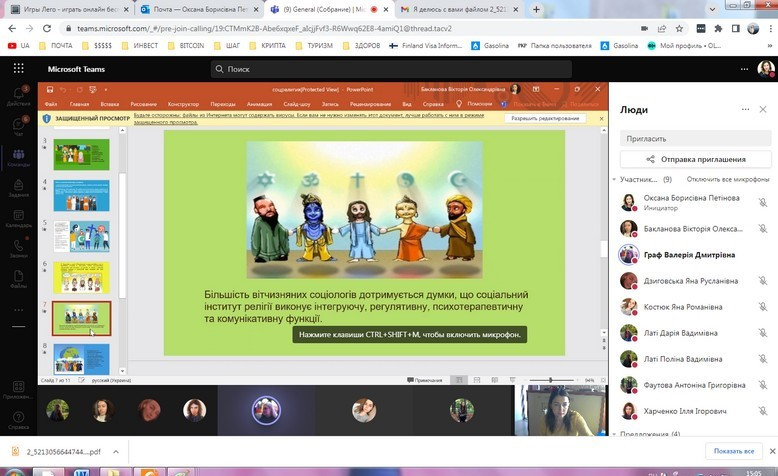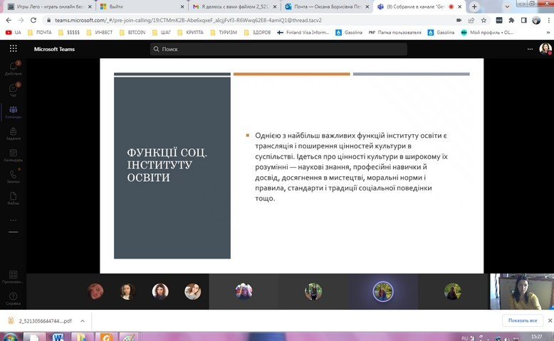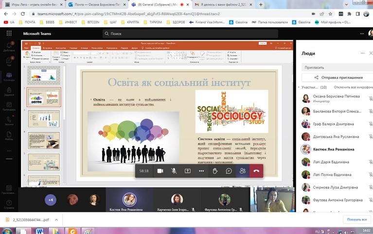 27 квітня 2022 року відбулося засідання в он-лайн форматі наукового гуртка, що діє на кафедрі філософії, соціології та менеджменту соціокультурної діяльності, «Південноукраїнські наукові студії» (керівник – проф. Петінова О. Б.); за бажанням гуртківців для обговорення було обрано тему «Соціальні інститути в сучасному суспільстві».