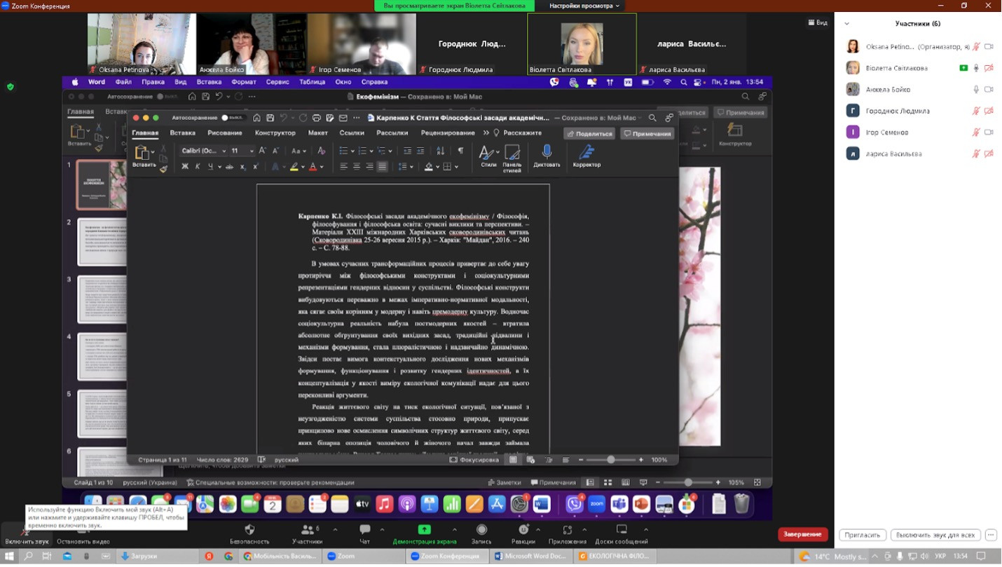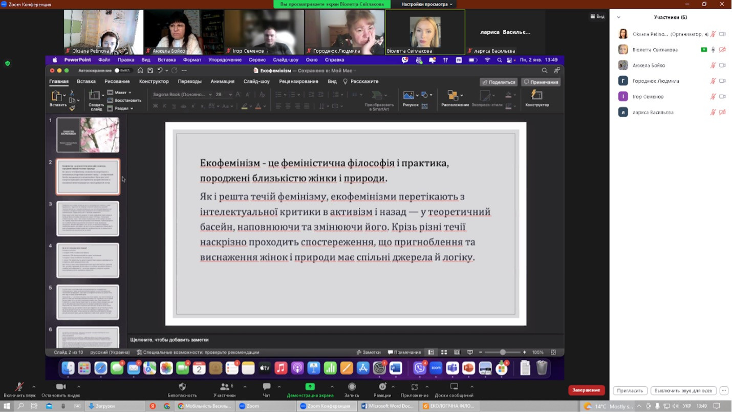 12 січня 2023 року здобувачі третього (освітньо-наукового) рівня вищої освіти спеціальності 033 Філософія галузі знань 03 Гуманітарні науки успішно захисили підсумкові роботи (ІНДЗ), виконані в межах проходження програми кредитної академічної мобільності в Черкаському державному технологічному університеті, навчальна дисципліна – Філософський дискурс сучасної України.На захисті були присутні викладач дисципліни Анжела Бойко, докторка філос. н., професорка, завідувачка кафедри філософських і політичних наук ЧДТУ та гарант ОНП Філософія проф. Оксана Петінова. Виступили здобувачі з темами: «Філософія трансгуманізму» (Ігор Семенов), «Екологічна філософія та екогуманізм в  сучасній Україні» (Лариса Васильєва), «Технологічні революції та  майбутнє» (Людмила Городнюк), «Екофеміністична проблематика в українському науковому дискурсі» (Віолета Світлицька).