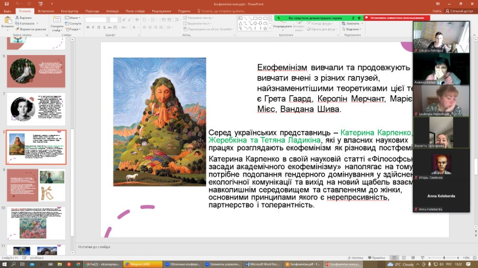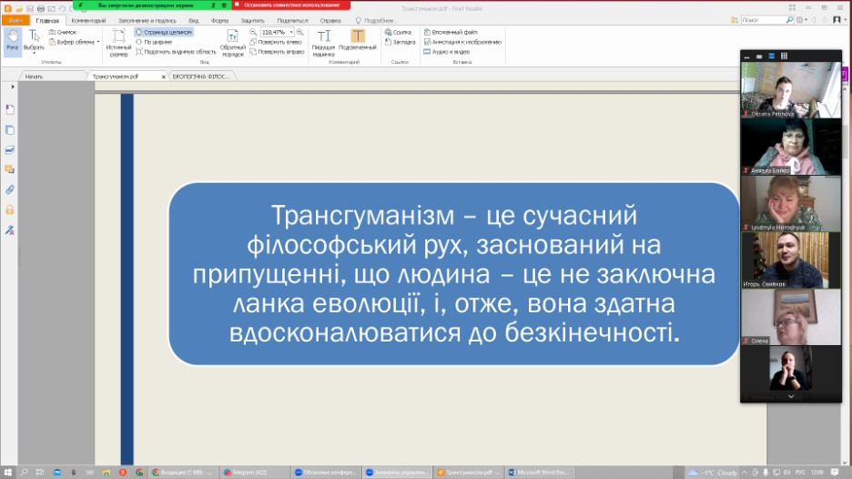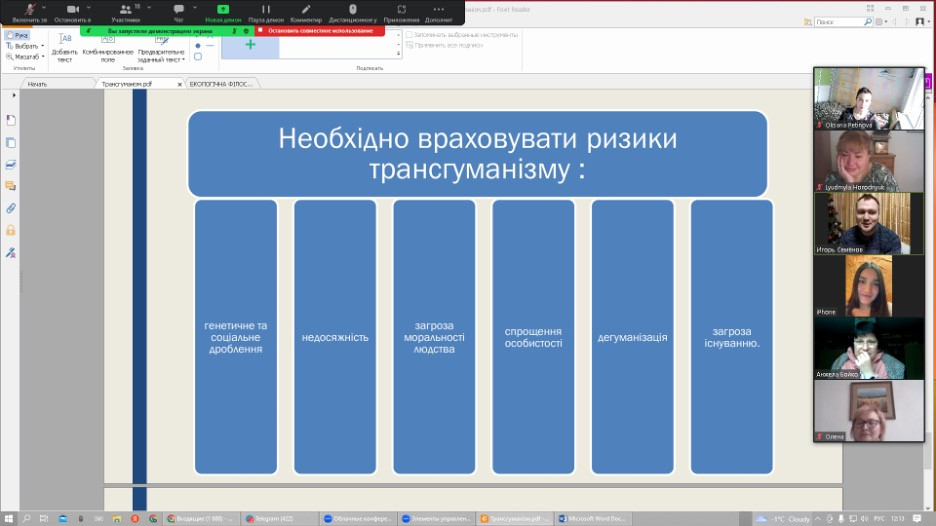 12 січня 2023 року в рамках угоди про співпрацю між ЗВО відбулося спільне засідання кафедри філософії, соціології та менеджменту соціокультурної діяльності (Університет Ушинського) та кафедри філософських і політичних наук (Черкаський державний технологічний університет).На науково-методологічному семінарі виступили здобувачі третього (освітньо-наукового) рівня вищої освіти спеціальності 033 Філософія галузі знань 03 Гуманітарні науки Університету Ушинського зі своїми підсумковими науковими розвідками та презентаціями, виконаними під час проходження кредитної академічної мобільності з навчальної дисципліни «Філософський дискурс сучасної України». На захисті були присутні викладач дисципліни Анжела Бойко, докторка філос. н., професорка, завідувачка кафедри філософських і політичних наук ЧДТУ, відповідальна за мобільність, та гарант ОНП Філософія проф. Оксана Петінова, відповідальна за мобільність, а також науково-педагогічні працівники обох кафедр, магістранти, студенти, аспіранти ЧДТУ та Університету Ушинського. Виступили здобувачі з темами: «Філософія трансгуманізму» (Ігор Семенов), «Екологічна філософія та екогуманізм в сучасній Україні» (Лариса Васильєва), «Технологічні революції та майбутнє» (Людмила Городнюк), «Екофеміністична проблематика в українському науковому дискурсі» (Віолета Світлицька). Присутні ставили доповідачам запитання, дискутували між собою, висловлювали свої позиції стосовно тієї чи іншої проблеми. Науково-методологічний семінар був дуже насиченим, інформаційним та інтерактивним.