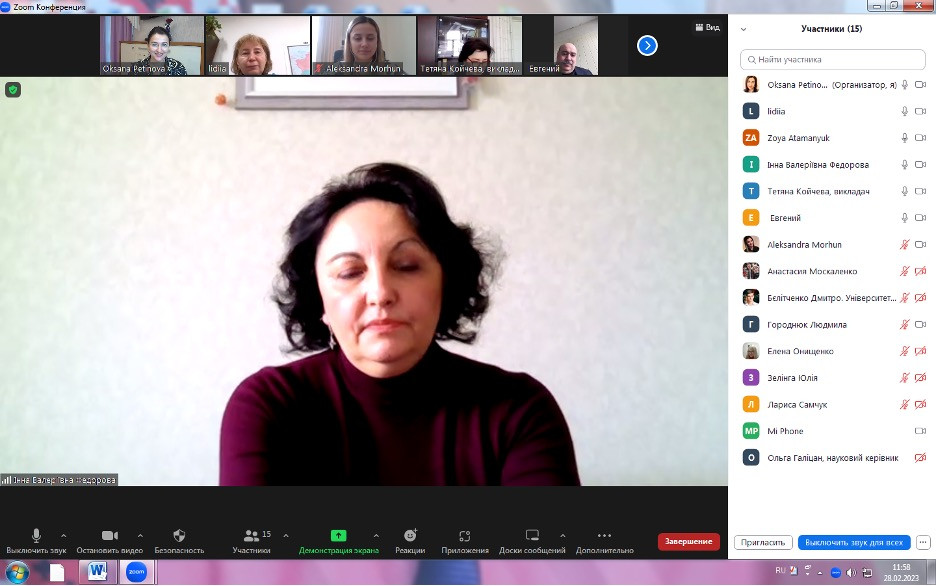 28 лютого 2023 року на запрошення гаранта ОПН Філософія проф. Оксани Петінової в межах реалізації україно-китайського освітньо-наукового проєкту «Освіта в глобалізованому суспільстві: філософія, менеджмент, культура (сучасні тенденції, економічні опції та міжнародні практики)» відбулася зустріч на тему «Бренд науковця в науковому середовищі Сходу».Спікер – Лідія Пироженко, доктор педагогічних наук, професор, експерт Міжнародного міжкультурного центру Університету Хучжоу. У заході взяли участь гаранти, наукові керівники ОНП Університету Ушинського, в тому числі науково-педагогічні працівники кафедри філософії, соціології та менеджменту соціокультурної діяльності (завідувач кафедри проф. Євген Борінштейн, проф. Олена Лісеєнко, доц. Зоя Атаманюк, викл. Лариса Самчук та інші), здобувачі третього (освітньо-наукового) рівня вищої освіти всіх форм навчання та спеціальностей, в тому числі, спеціальності 033 Філософія. На основі договору пор співпрацю долучились представники дружньої кафедри філософії та педагогіки ЗВО-партнера НТУ «Дніпровська політехніка», зокрема, гарант ОНП Філософія проф. Юлія Шабанова.