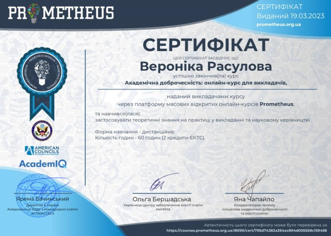 Протягом тижня студенти Расулова Вероніка (2 курс бакалаврату, спеціальність «Публічне управління та адміністрування»), Патерко Яна, Тараненко Катерина (1 курс магістратури, спеціальність «Менеджмент») пройшли онлайн-курс «Академічна доброчесність» на платформі Prometheus. Під час роботи на платформі студенти дізналися про теоретичні аспекти академічної доброчесності та чинники, що безпосередньо впливають на культуру академічної доброчесності здобувачів вищої освіти, а також навчилися застосовувати теоретичні знання на практиці. Було отримано відповідні сертифікати про проходження курсу.