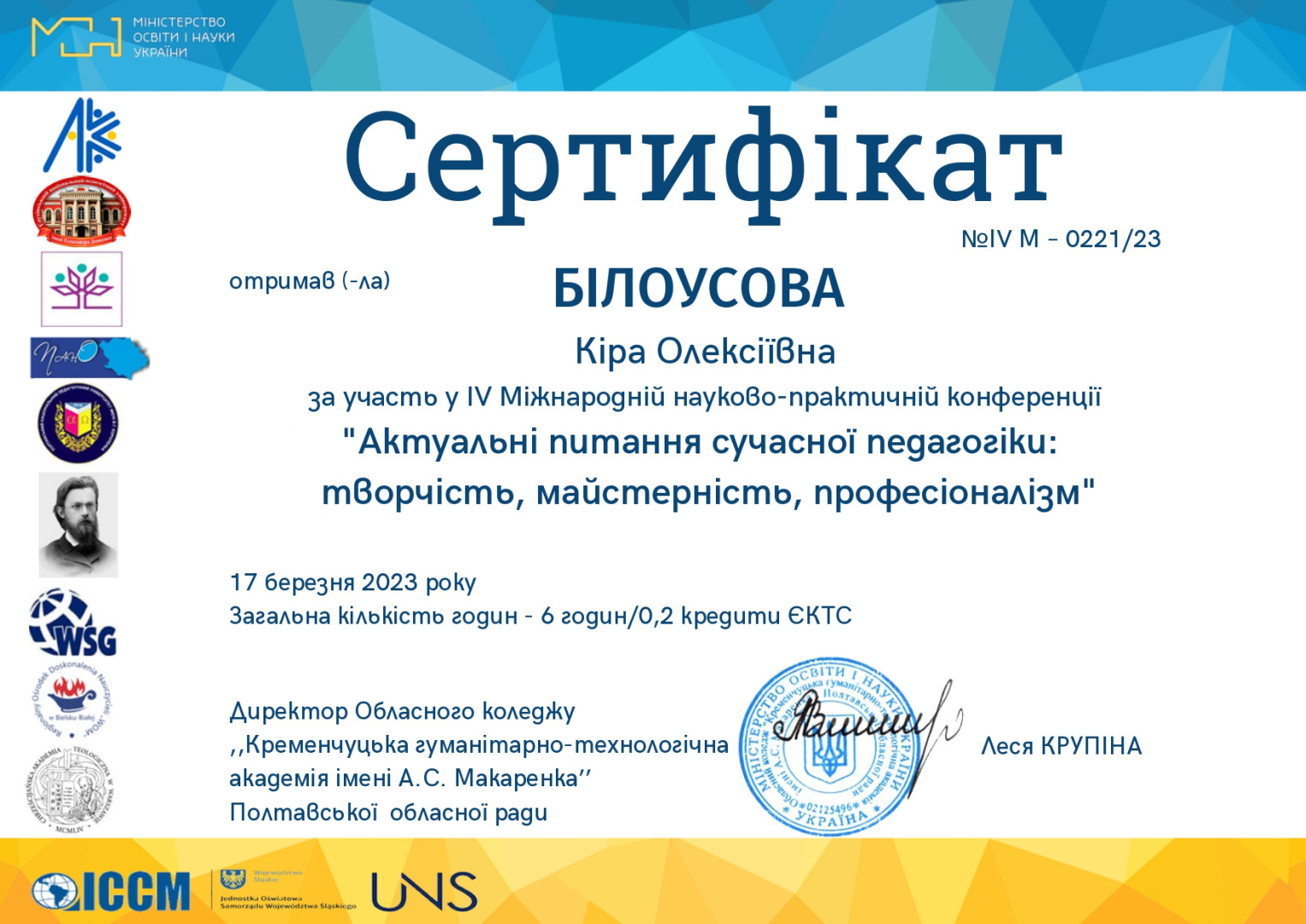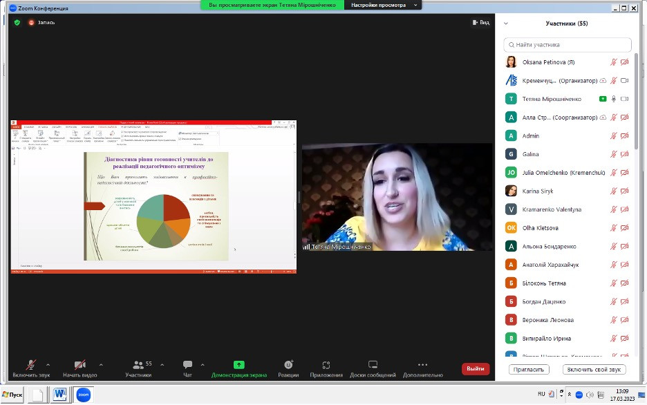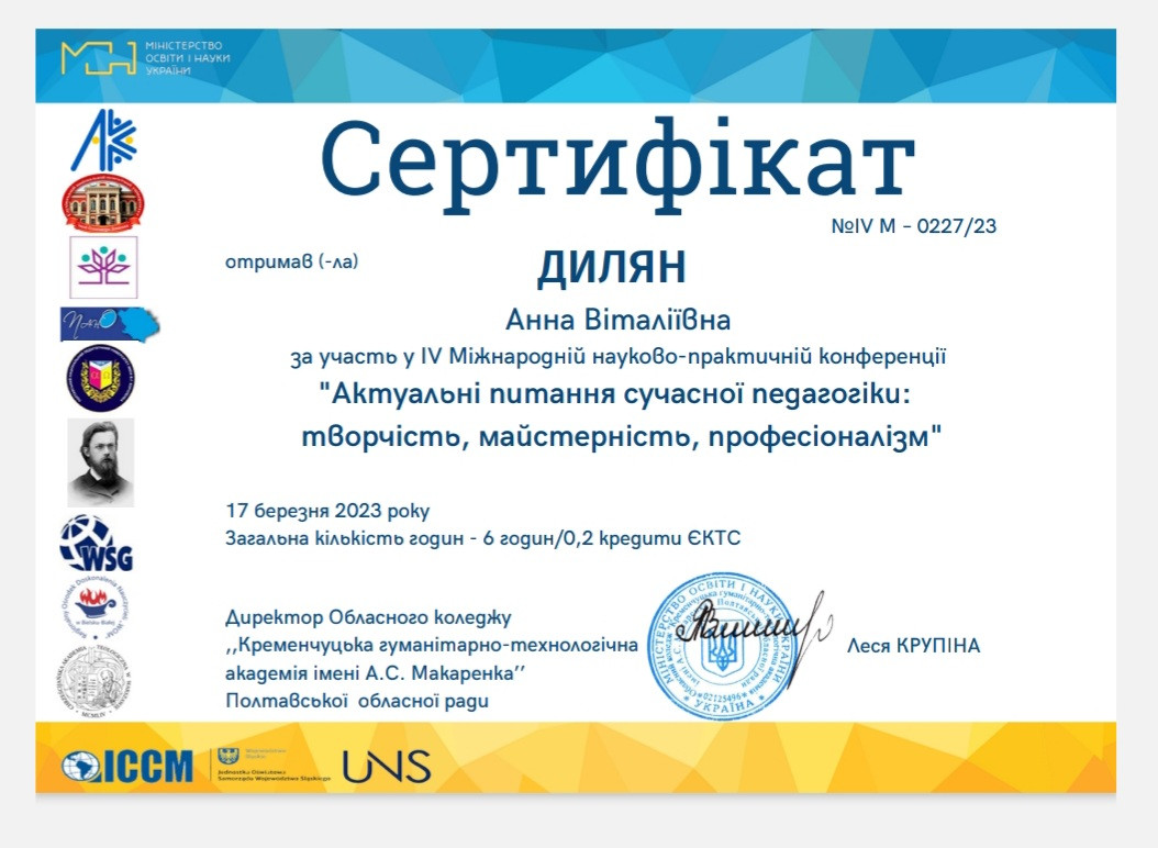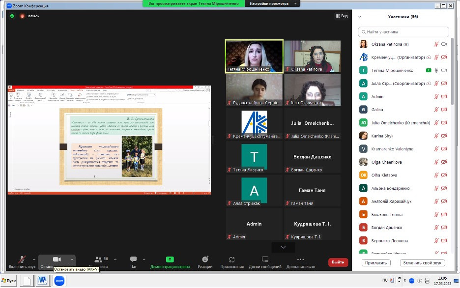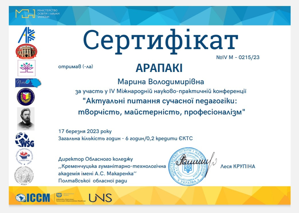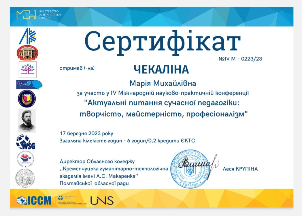 Науково-педагогічні працівники кафедри філософії, соціології та менеджменту соціокультурної діяльності та здобувачі першого (бакалаврського) рівня вищої освіти ОПП «Менеджмент соціокультурної діяльності» долучилися до обговорення актуальних питань освітнього процесу в рамках ІV Міжнародної викладацько-студентської науково-практичної конференції ,,Актуальні питання сучасної педагогіки: творчість, майстерність, професіоналізм’’, яка відбулася у березні 2023 року в Обласному коледжі ,,Кременчуцька гуманітарно-технологічна академія імені А.С. Макаренка’’ Полтавської обласної ради. Метою конференції було визначено розширення наукового інформаційного обміну між провідними спеціалістами закладів вищої освіти у галузі сучасної педагогіки, а також залучення талановитих практикуючих викладачів до науково-дослідницької роботи. Тематичні напрямки роботи конференції: психологія та педагогіка вищої школи: актуальні питання; модернізація інноваційних методик і технологій у закладах освіти; дослідження лінгвістики та лінгводидактики на сучасному етапі; науки про освіту в інформаційному суспільств, тощо.