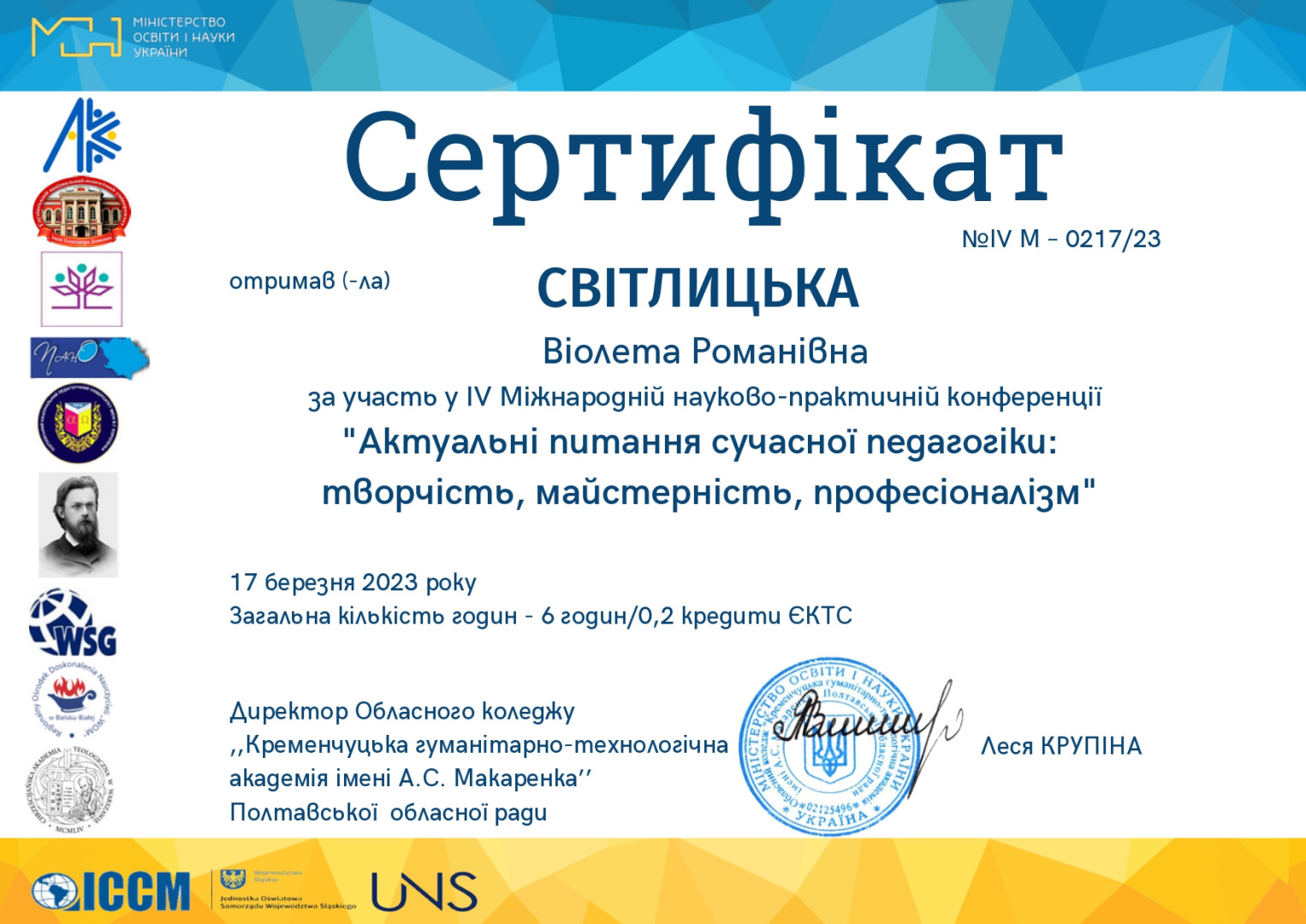 Науково-педагогічні працівники кафедри філософії, соціології та менеджменту соціокультурної діяльності та здобувачі першого (бакалаврського) рівня вищої освіти ОПП «Менеджмент соціокультурної діяльності» долучилися до обговорення актуальних питань освітнього процесу в рамках ІV Міжнародної викладацько-студентської науково-практичної конференції ,,Актуальні питання сучасної педагогіки: творчість, майстерність, професіоналізм’’, яка відбулася у березні 2023 року в Обласному коледжі ,,Кременчуцька гуманітарно-технологічна академія імені А.С. Макаренка’’ Полтавської обласної ради.