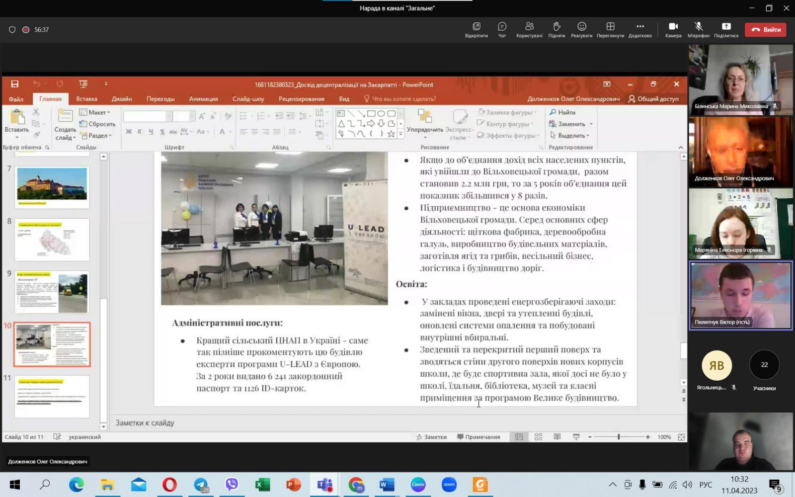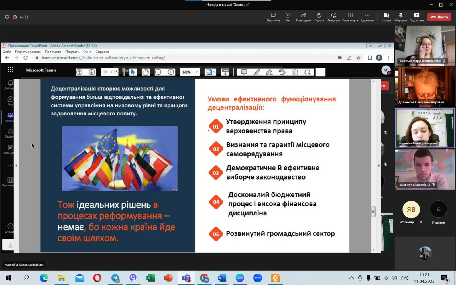 11 квітня 2023 року на кафедрі освітнього менеджменту та публічного управління в онлайн-режимі відбулося засідання наукового гуртка студентів бакалаврату спеціальності 281 «Публічне управління та адміністрування». Було детально обговорено важливу та актуальну тему – реформу децентралізації в Україні.