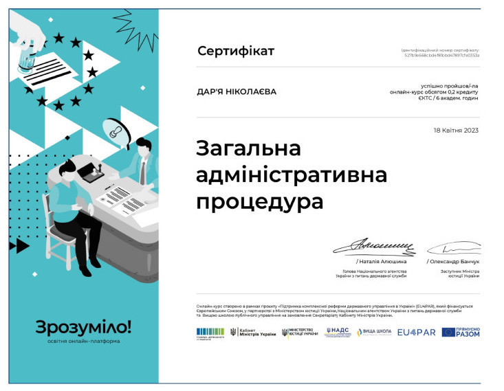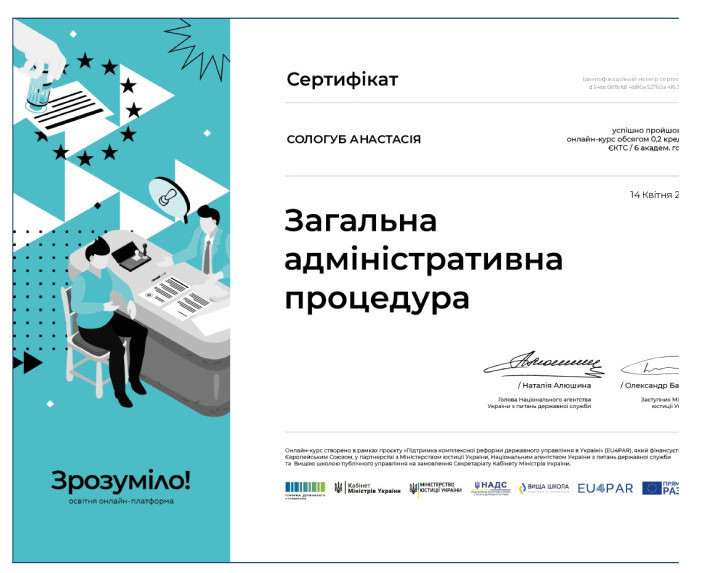 Успішно пройшли навчання та склали підсумкове тестування з теми «Загальна адміністративна процедура» 19 студентів 1-4 курсів: Бодюл Христина, Васильчук Тетяна, Веремчук Поліна, Волошина Діана, Гаврилюк Анастасія, Головко Назар, Голубенко Олександра, Кіцельман Катерина, Кюркчю Евеліна, Маряніна Елеонора, Мінескурт Крістіна, Некрасова Анастасія, Ніколаєва Дар’я, Расулова Вероніка, Сітніченко Жанна, Соловей Дар’я, Сологуб Анастасія, Сторожук Альона, Туневич Анастасія.