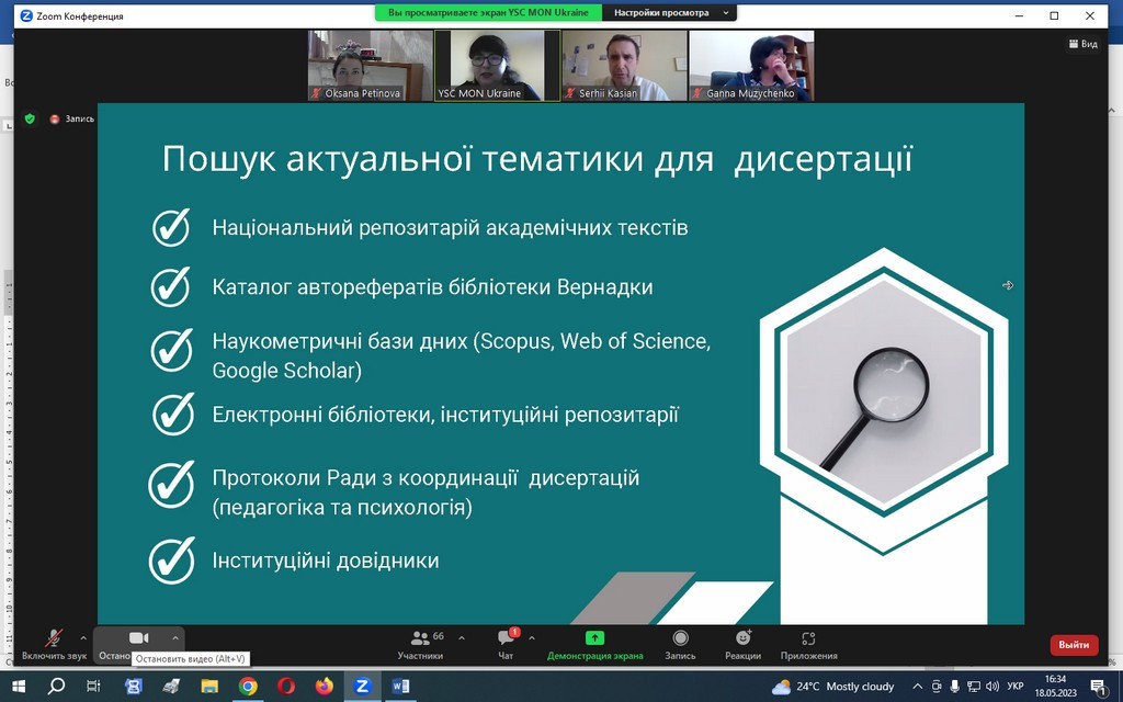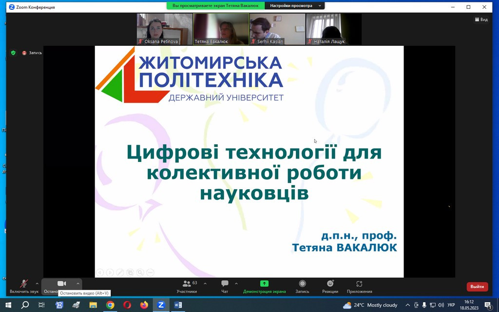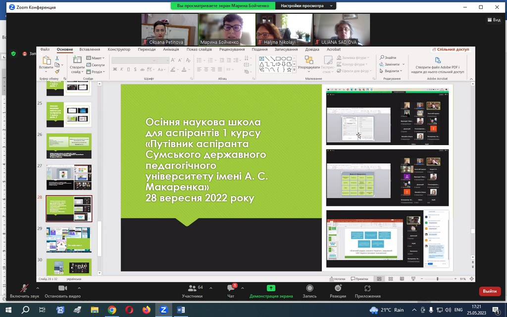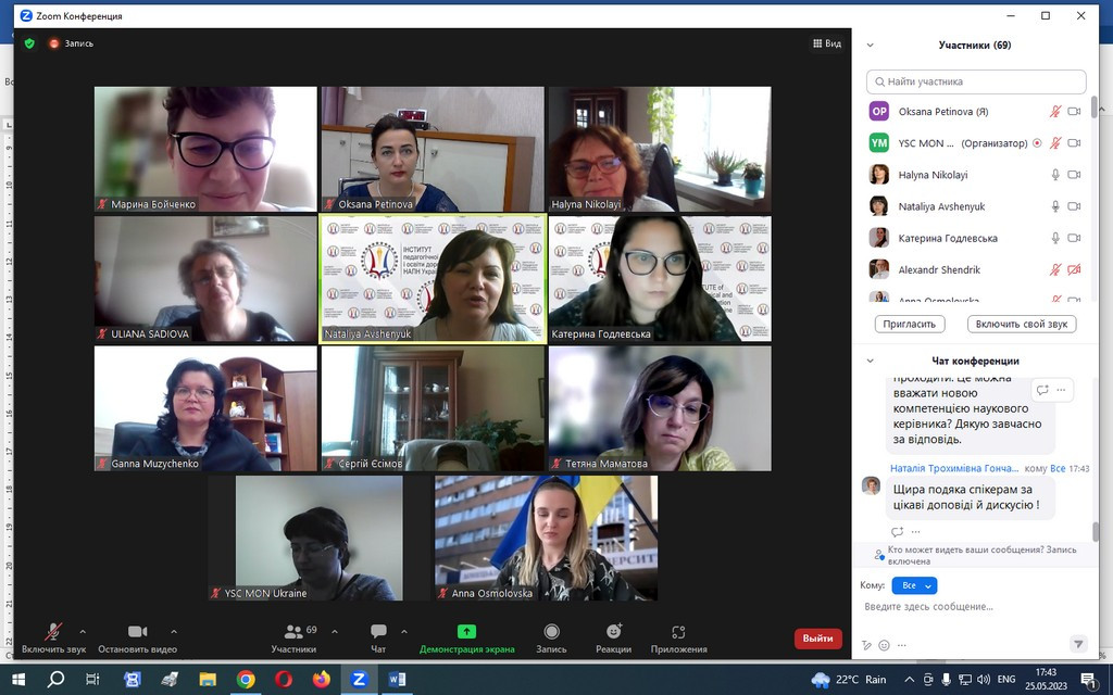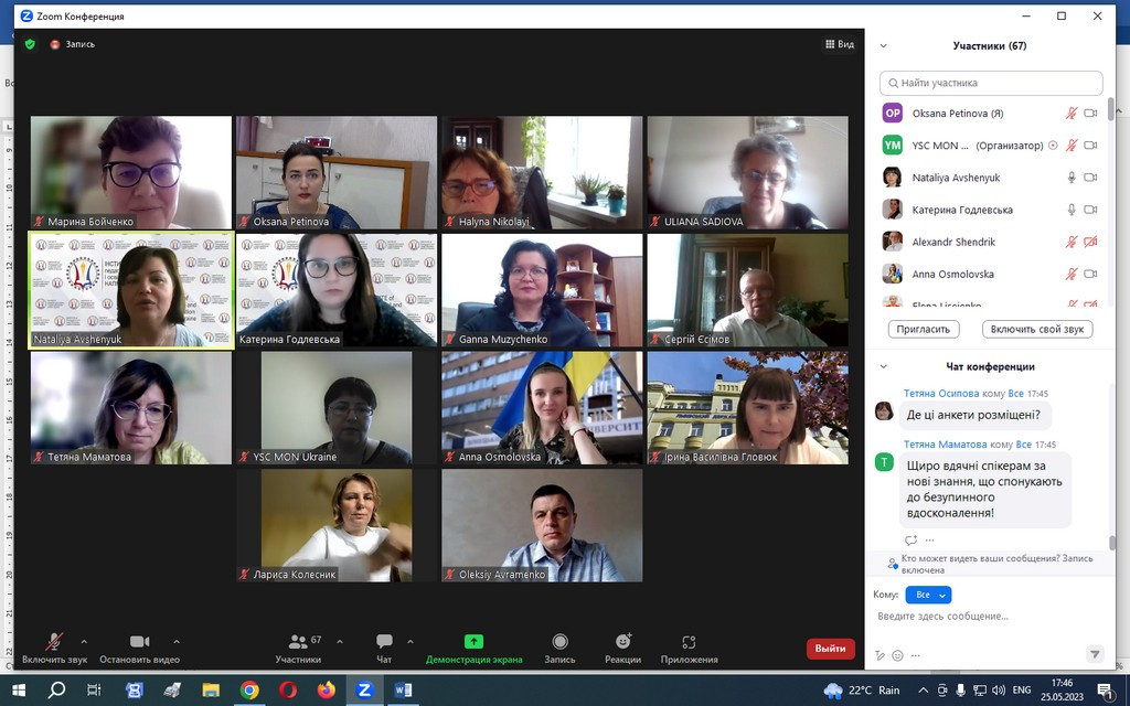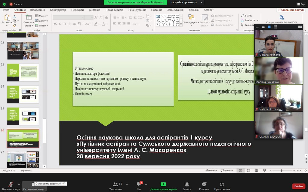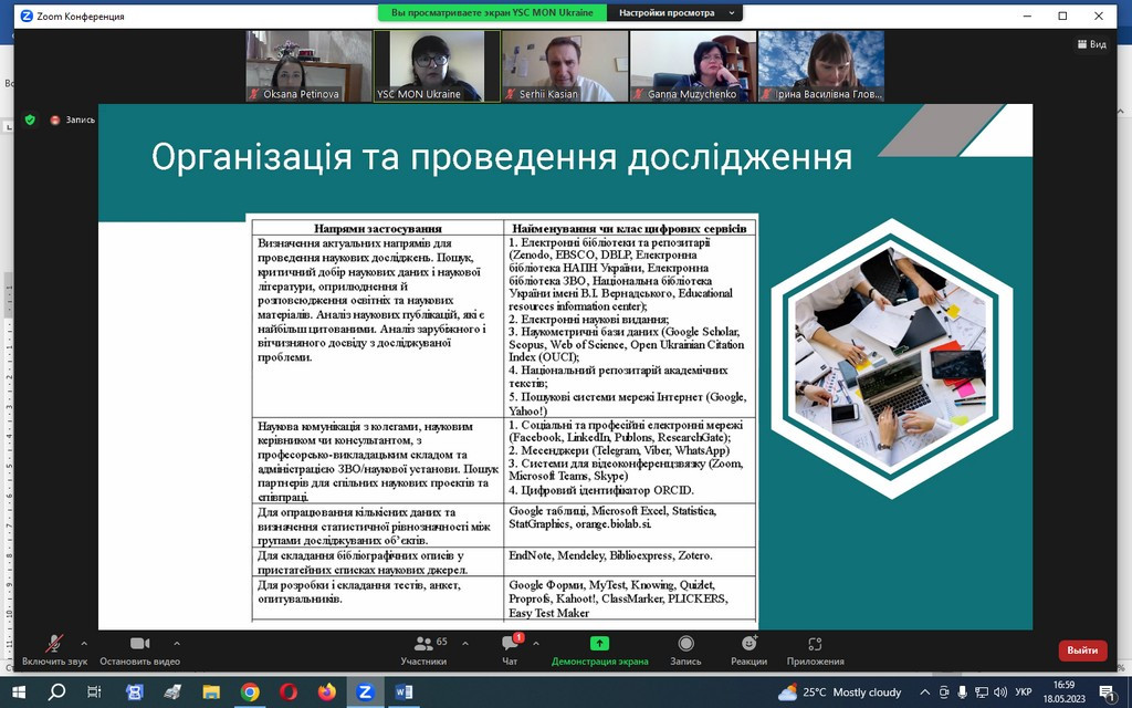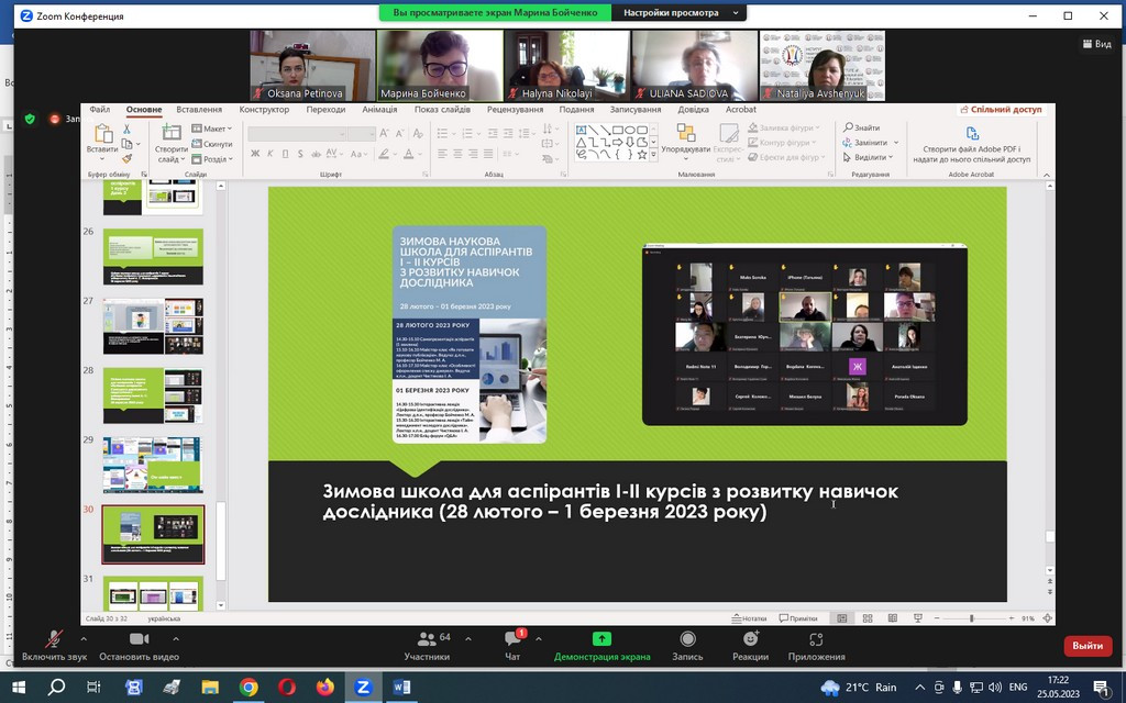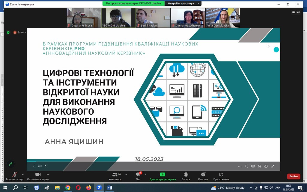 Наукові керівники здобувачів третього (освітньо-наукового) рівня вищої освіти ОНП «Філософія», НПП кафедри філософії, соціології та менеджменту соціокультурної діяльності (проф. Олена Лісеєнко, проф. Оксана Петінова, доц. Зоя Атаманюк, доц. Галина Врайт та інші), учасники програми підвищення кваліфікації «Інноваційний науковий керівник» мали можливість опрацювати ряд важливих тем. Спікерами наступних модулів були: проф. Тетяна Вакалюк, доктор пед. наук, професор кафедри інженерії програмного забезпечення ДУ «Житомирська політехніка», провідний науковий співробітник Інституту цифровізації НАПН України; Анна Яцишин, доктор пед. наук, провідний науковий співробітник Інституту цифровізації НАПН України, координатор Офісум підтримки вченого; проф. Наталія Авшенюк, доктор пед. наук, завідувач відділу зарубіжних систем педагогічної освіти та освіти дорослих Інституту педагогічної освіти і освіти дорослих імені Івана Зазюна НАПН України, членкиня Національного агенства із забезпечення якості вищої освіти; проф. Марина Бойченко, доктор пед. наук, завідувач кафедри педагогіки Сумського державного педагогічного університету імені А. С. Макаренка; Катерина Годлевська, кандидат пед. наук, старший науковий співробітник відділу зарубіжних систем педагогічної освіти і освіти дорослих Інституту педагогічної освіти і освіти дорослих імені Івана Зазюна НАПН України. Говорили про підготовку докторів філософії та наукову супервізію, розглядали ключові тренди зарубіжного освітнього простору; аналізували досвід докторських шкіл, підходи до організації та адміністрування з урахуванням кращих зарубіжних практик. Особливий інтерес у слухачів викликало обговорення проблеми обробки та візуалізації даних в науковій діяльності за допомогою ІКТ та використання цифрових технологій й інструментів відкритої науки для виконання наукового дослідження і колективної роботи науковців. Завершенням програми підвищення кваліфікації став круглий стіл, в рамках якого всі учасники висловили свої враження, поділилися рефлексіями, пропозиціями, перспективами бачення подальшого розвитку проєкту.