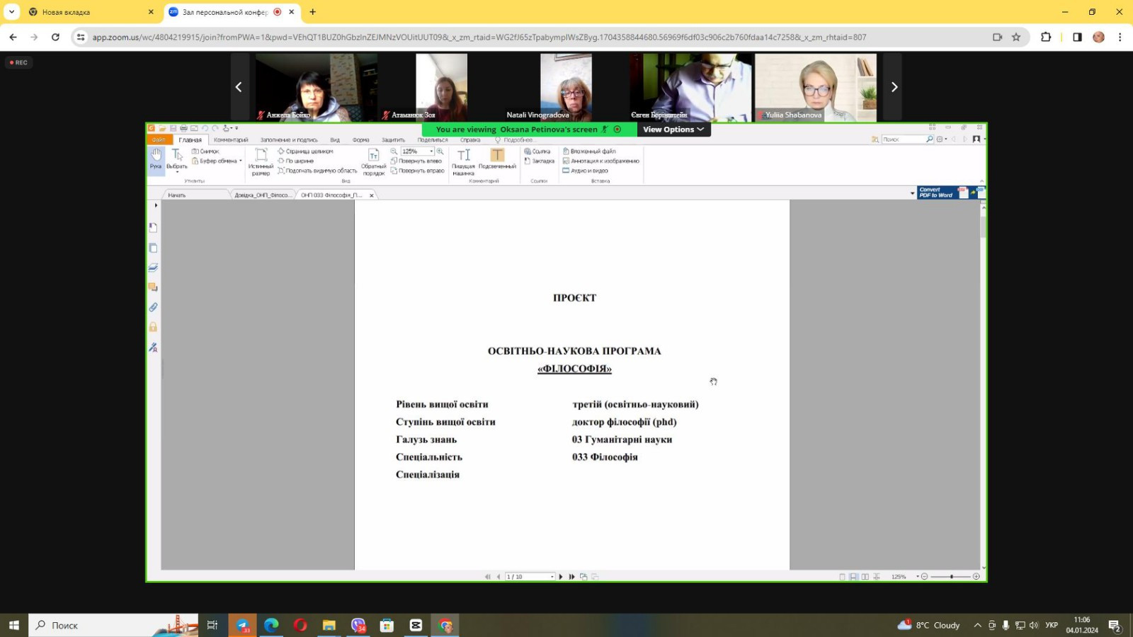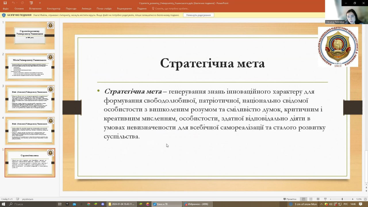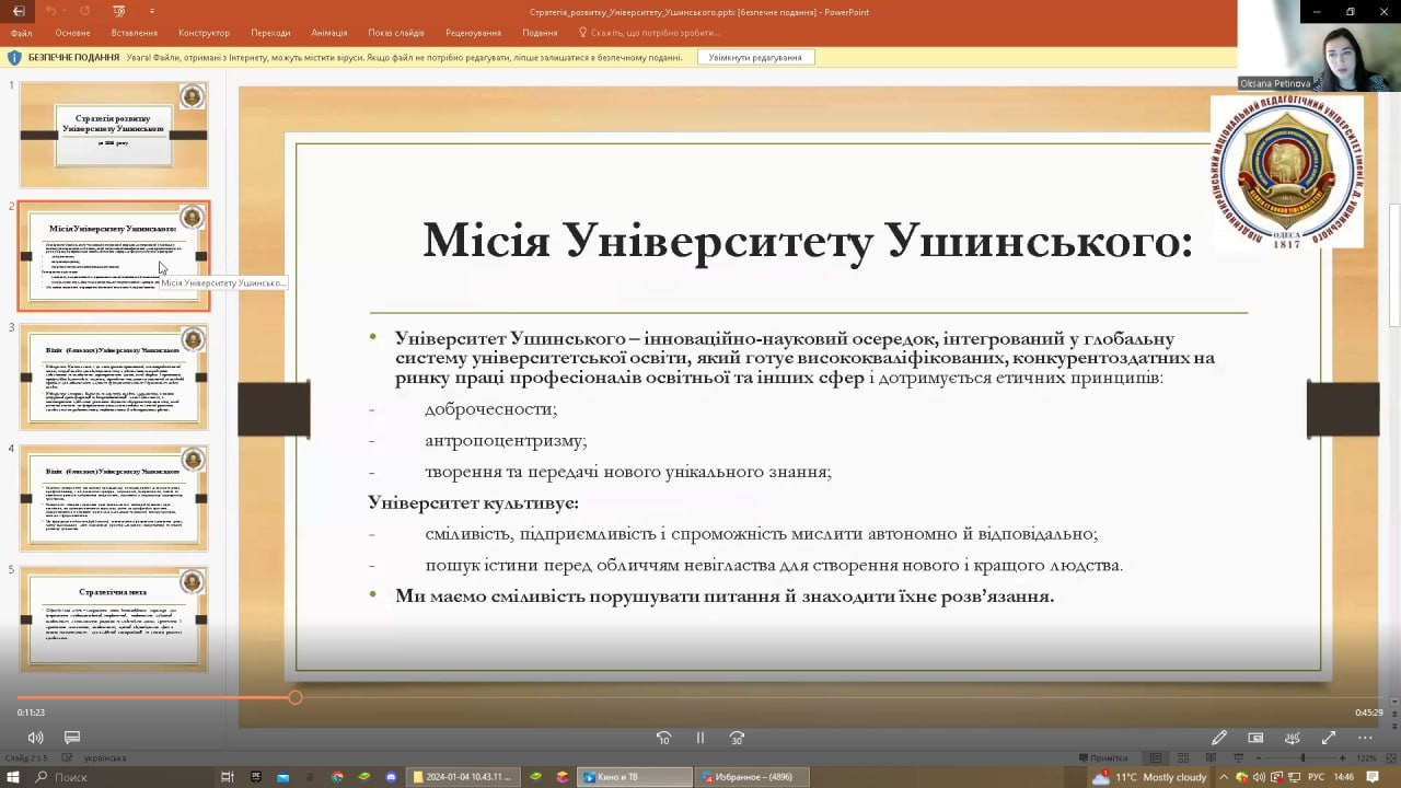 04 січня 2024 року відбулося відкрите громадське обговорення проєкту ОНП «Філософія» 2024. До засідання долучилися проректор з наукової роботи Університету Ушинського проф. Ганна Музиченко, здобувачі третього (освітньо-наукового) рівня вищої освіти всіх років навчання ОНП «Філософія», науково-педагогічні працівники кафедри філософії, соціології та менеджменту соціокультурної діяльності, в тому числі Гарант ОНП проф. Оксана Петінова та члени робочої групи (завідувач кафедри проф. Євген Борінштейн, доц. Зоя Атаманюк, доц. Галина Врайт, здобувачка Людмила Городнюк), стейкхолдери, ЗВО-партнери (НУ «Одеська політехніка», Державний університет інтелектуальних технологій і зв'язку). Активну участь в обговоренні взяли гості з інших міст України: проф. Анжела Бойко (Черкаський державний технологічний університет), проф. Юлія Шабанова (Дніпровська академія музики), проф. Олексій Халапсис (Дніпропетровський державний університет внутрішніх справ), які надали слушні рекомендації щодо вдосконалення ОНП та висловили власне бачення перспектив розвитку програми. Зустріч була дуже насиченою та результативною.