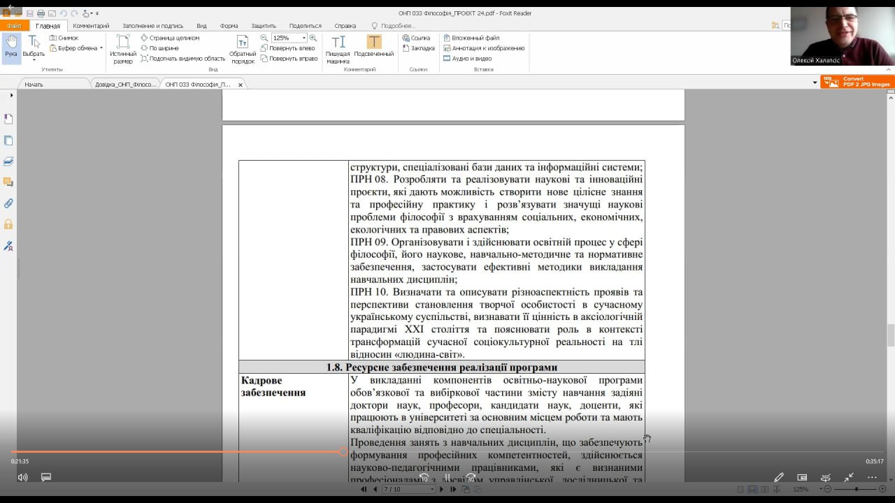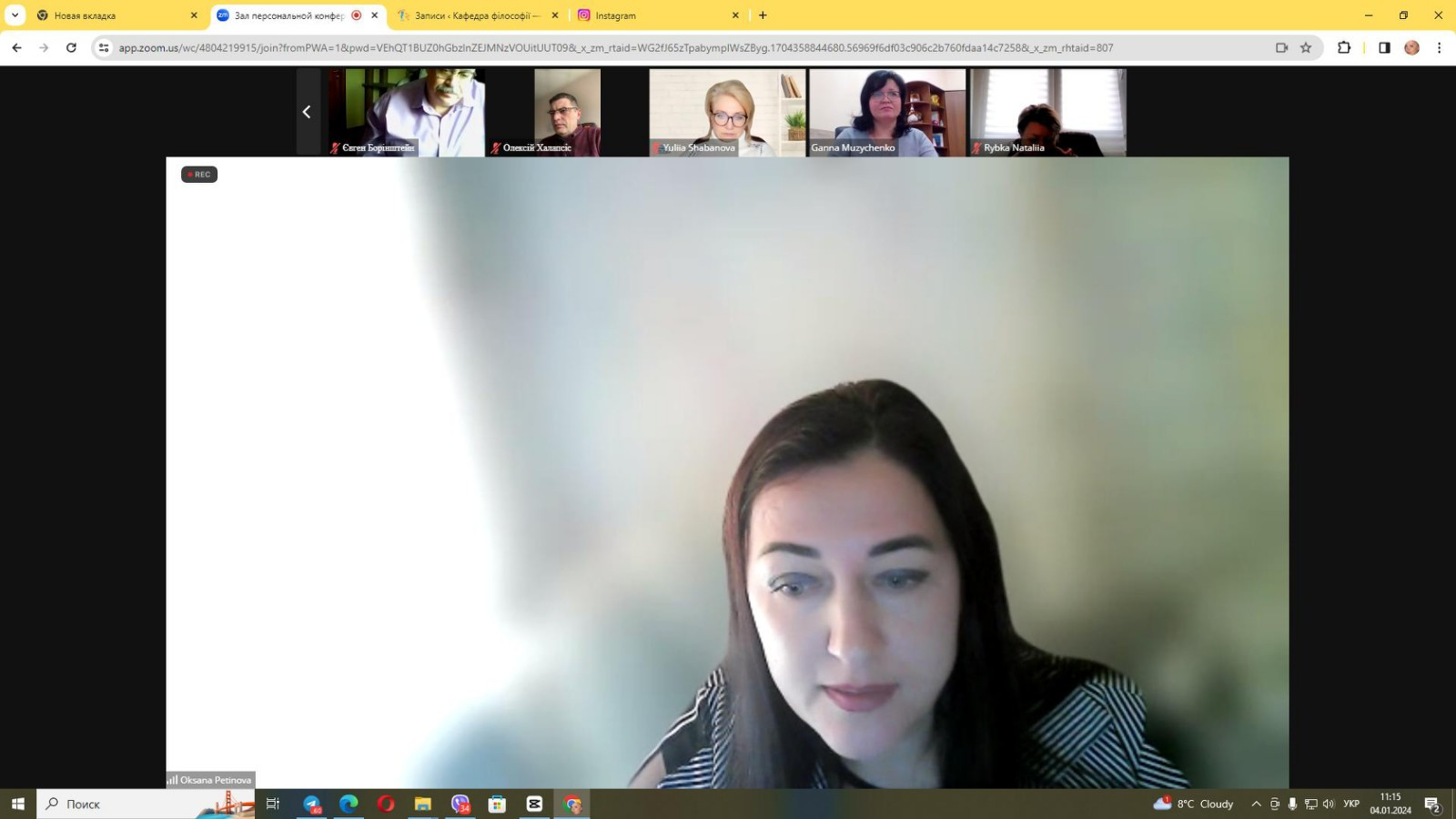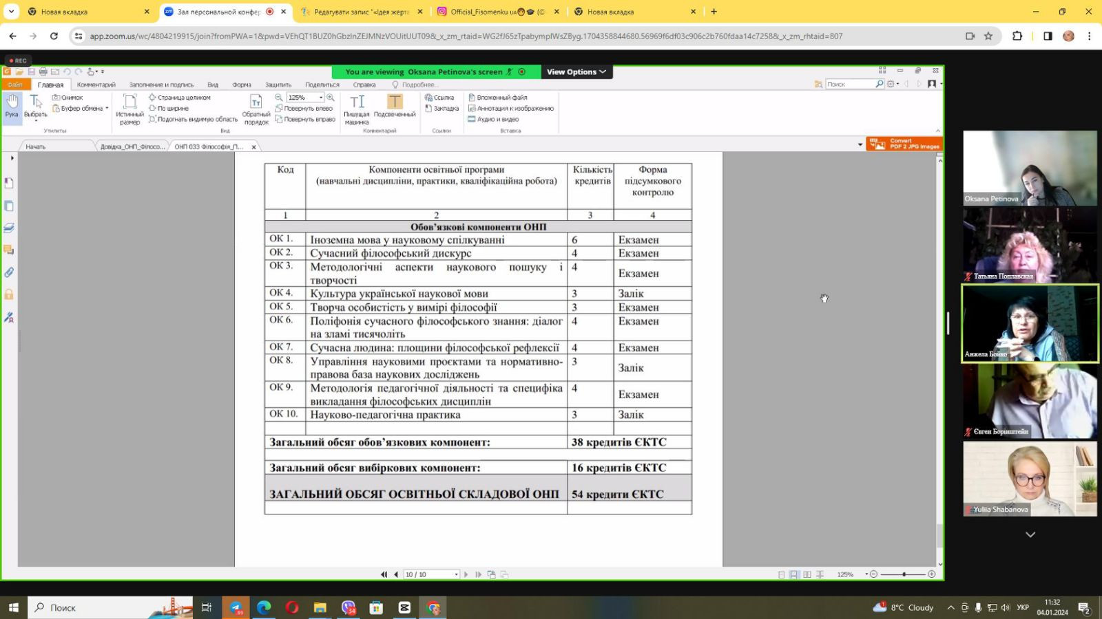 04 січня 2024 року відбулося відкрите громадське обговорення проєкту ОНП «Філософія» 2024. До засідання долучилися проректор з наукової роботи Університету Ушинського проф. Ганна Музиченко, здобувачі третього (освітньо-наукового) рівня вищої освіти всіх років навчання ОНП «Філософія», науково-педагогічні працівники кафедри філософії, соціології та менеджменту соціокультурної діяльності, в тому числі Гарант ОНП проф. Оксана Петінова та члени робочої групи (завідувач кафедри проф. Євген Борінштейн, доц. Зоя Атаманюк, доц. Галина Врайт, здобувачка Людмила Городнюк), стейкхолдери, ЗВО-партнери (НУ «Одеська політехніка», Державний університет інтелектуальних технологій і зв'язку). Активну участь в обговоренні взяли гості з інших міст України: проф. Анжела Бойко (Черкаський державний технологічний університет), проф. Юлія Шабанова (Дніпровська академія музики), проф. Олексій Халапсис (Дніпропетровський державний університет внутрішніх справ), які надали слушні рекомендації щодо вдосконалення ОНП та висловили власне бачення перспектив розвитку програми. Зустріч була дуже насиченою та результативною.