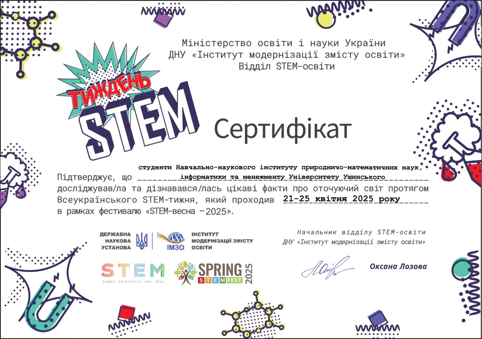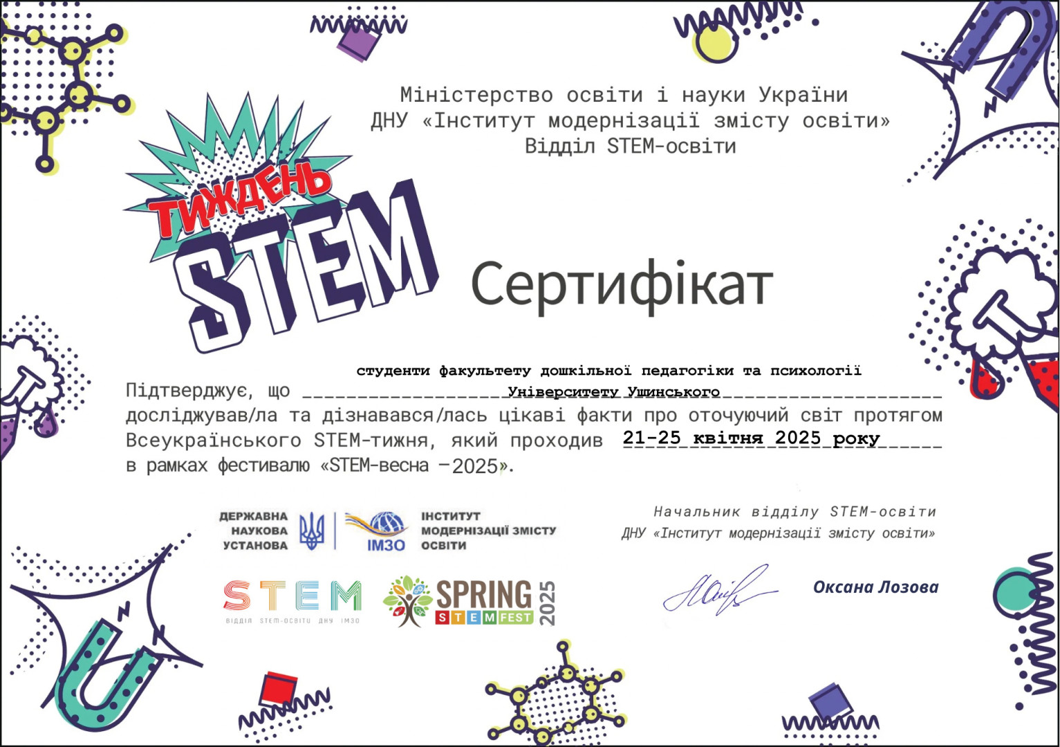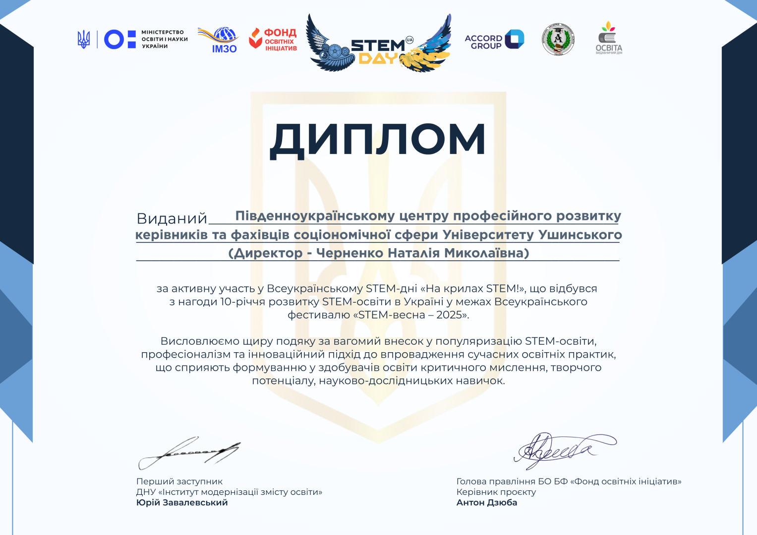 Колектив Південноукраїнського центру професійного розвитку керівників та фахівців соціономічної сфери Університету Ушинського отримав диплом за активну участь у Всеукраїнському STEM-дні «На крилах STEM!», що відбувся з нагоди 10-річчя розвитку STEM-освіти в Україні у межах Всеукраїнського фестивалю «STEM-весна - 2025», організованого Відділом STEM-освіти Державної наукової установи «Інститут модернізації змісту освіти»