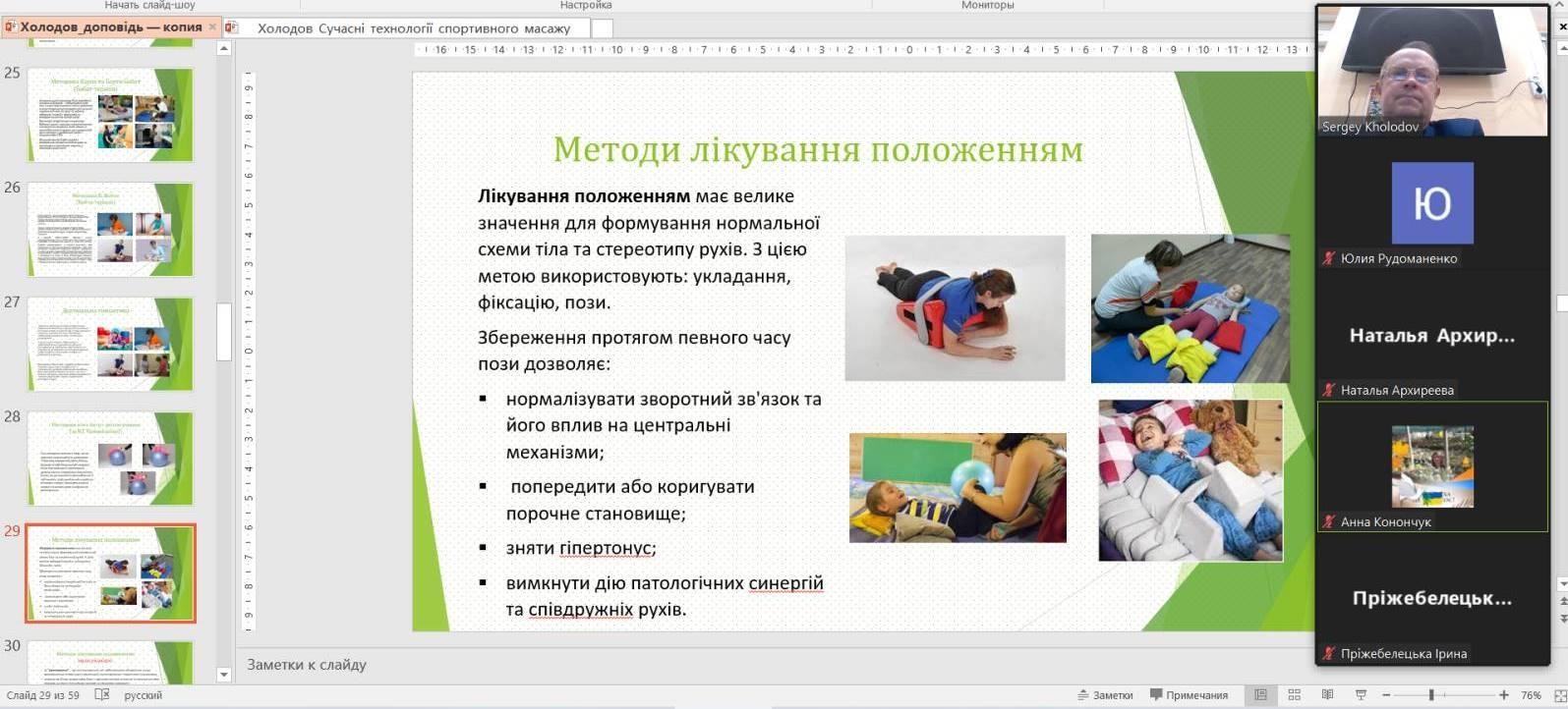 24 травня 2022 року на базі Південноукраїнського центру професійного розвитку керівників та фахівців соціономічної сфери Університету Ушинського в рамках курсів підвищення кваліфікації фахівців зі спеціальності 017 Фізична культура і спорт «Сучасні технології у сфері фізичної реабілітації та ерготерапії» відбувся онлайн-семінар кандидата педагогічних наук, доцента, приват-професора кафедри біології і охорони здоров’я Холодова Сергія Анатолійовича «Сучасні технології масажу та реабілітації дітей з порушеннями опорно-рухового апарату та нервової системи».