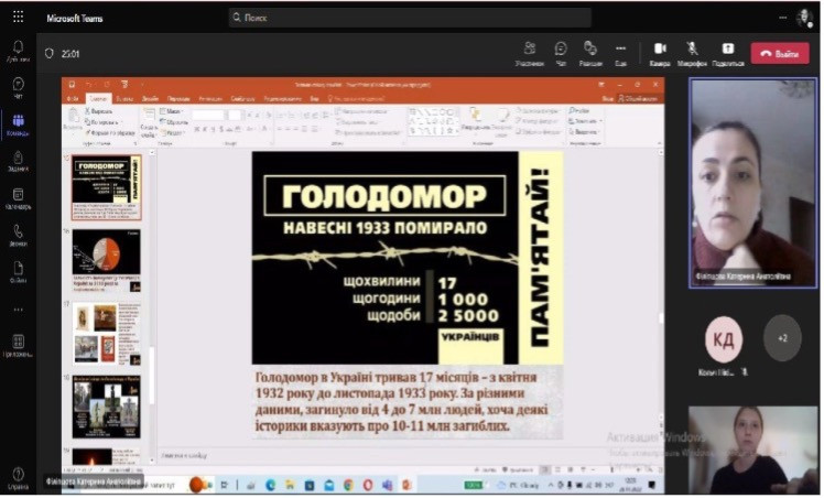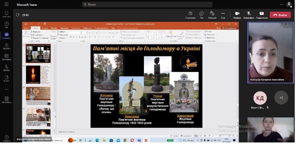 У кожну четверту суботу листопада в Україні щорічно відзначається скорботна пам’ятна дата – День пам’яті жертв Голодомору. З цього приводу доцентом кафедри біології і охорони здоров’я Університету Ушинського Філіпцовою Катериною Анатоліївною проведено виховну роботу зі студентами 3 року навчання спеціальності 014 Середня освіта (Фізична культура).