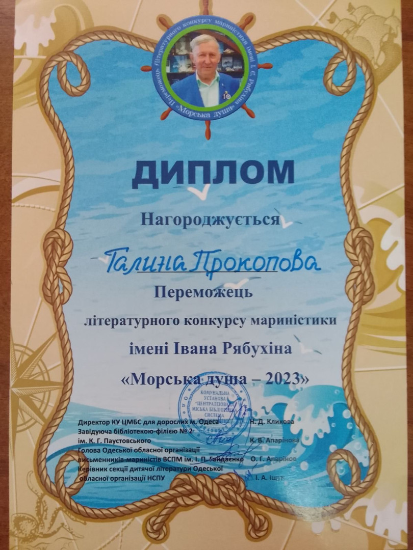 Літературний конкурс "Морська душа-2023", присвячений одеському поету-мариністу Івану Рябухіну, продемонстрував ваші літературні таланти та здатність переносити слухачів до чарівного світу моря. Вітаємо вас з цим досягненням, яке стало результатом вашої творчості, пристрасті та натхнення! Ви змогли вразити журі та глядачів своїм виконанням, яке проникає у саму суть морської душі, передає відчуття безмежної краси морського простору. Ви заслужили це визнання, і ми пишаємося вами!
