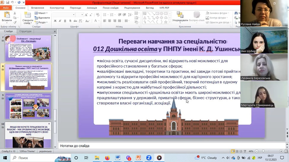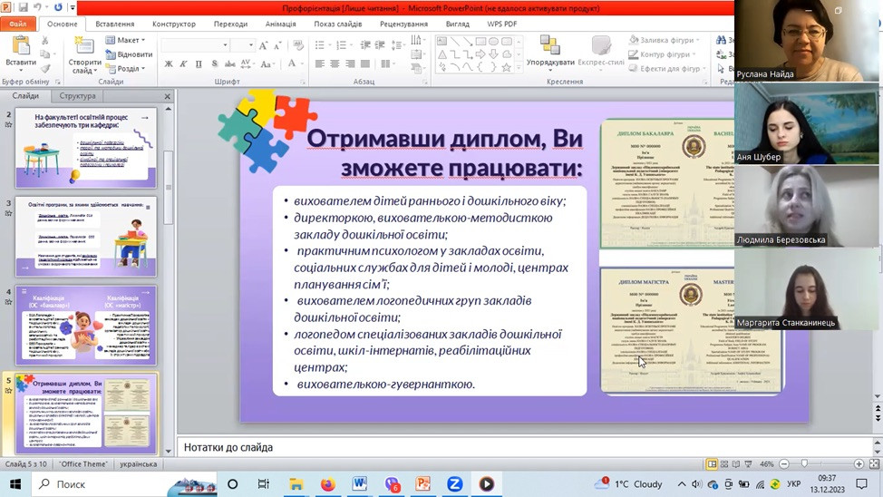 Задля підвищення професійної орієнтації 13 грудня 2023 р. відбулася онлайн зустріч із випускниками ВСП «Дубенський педагогічний фаховий коледж РДГУ». Онлайн-профорієнтаційна зустріч для здобувачів четвертого року навчання спеціальності 012 «Дошкільна освіта» проведена завідувачкою кафедри теорії та методики дошкільної освіти д.п.н., проф. Людмилою Березовською та д.п.н., доц. Русланою Найдою.