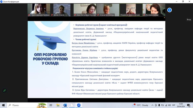 26 квітня 2024 року з ініціативи гаранта освітньо-професійної програми «Дошкільна освіта. Практична психологія в закладах дошкільної освіти» за другим (магістерським) рівнем вищої освіти, докторки педагогічних наук, професорки, завідувачки кафедри теорії та методики дошкільної освіти Людмили Березовської відбулося обговорення освітньо-професійної програми зі стейкголдерами та роботодавцями. У ході онлайн-зустрічі Людмила Іванівна наголосила на важливості співпраці наукової спільноти зі стейкголдерами, щодо удосконалення змісту освітньо-професійної програми, забезпечення її відповідності до вимог сьогодення.