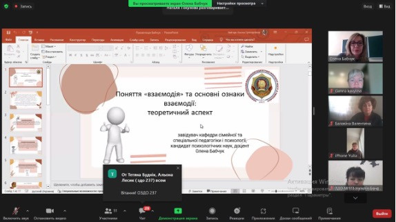 - «Поняття “взаємодія” та основні ознаки взаємодії. Теоретичний аспект» (презентація завідувачки кафедри сімейної та спеціальної педагогіки і психології Університету Ушинського Олени Бабчук);
