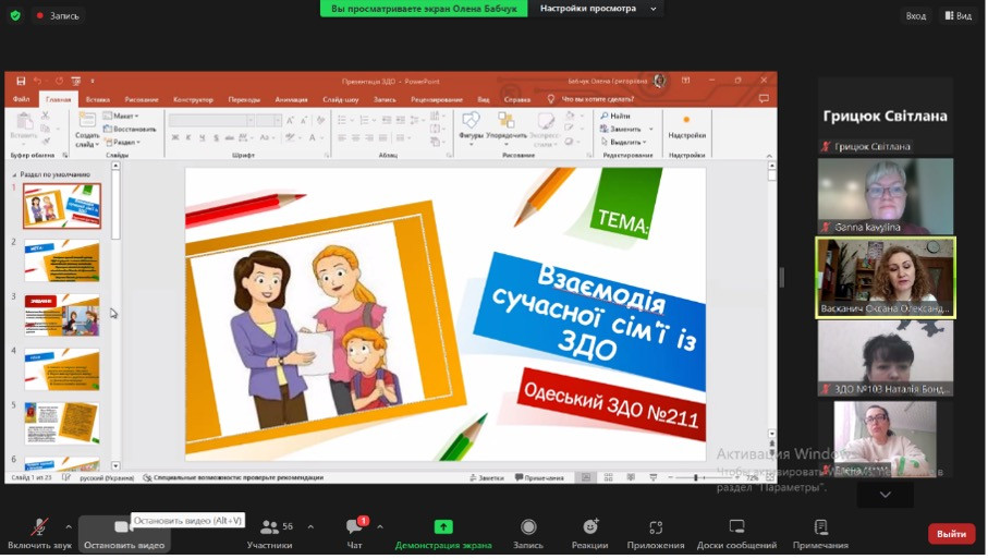 - «Напрями та форми взаємодії фахівців закладу дошкільної освіти з родинами вихованців» (доповідь вихователя-методиста Одеського ЗДО № 211 Олени Бесарабець);