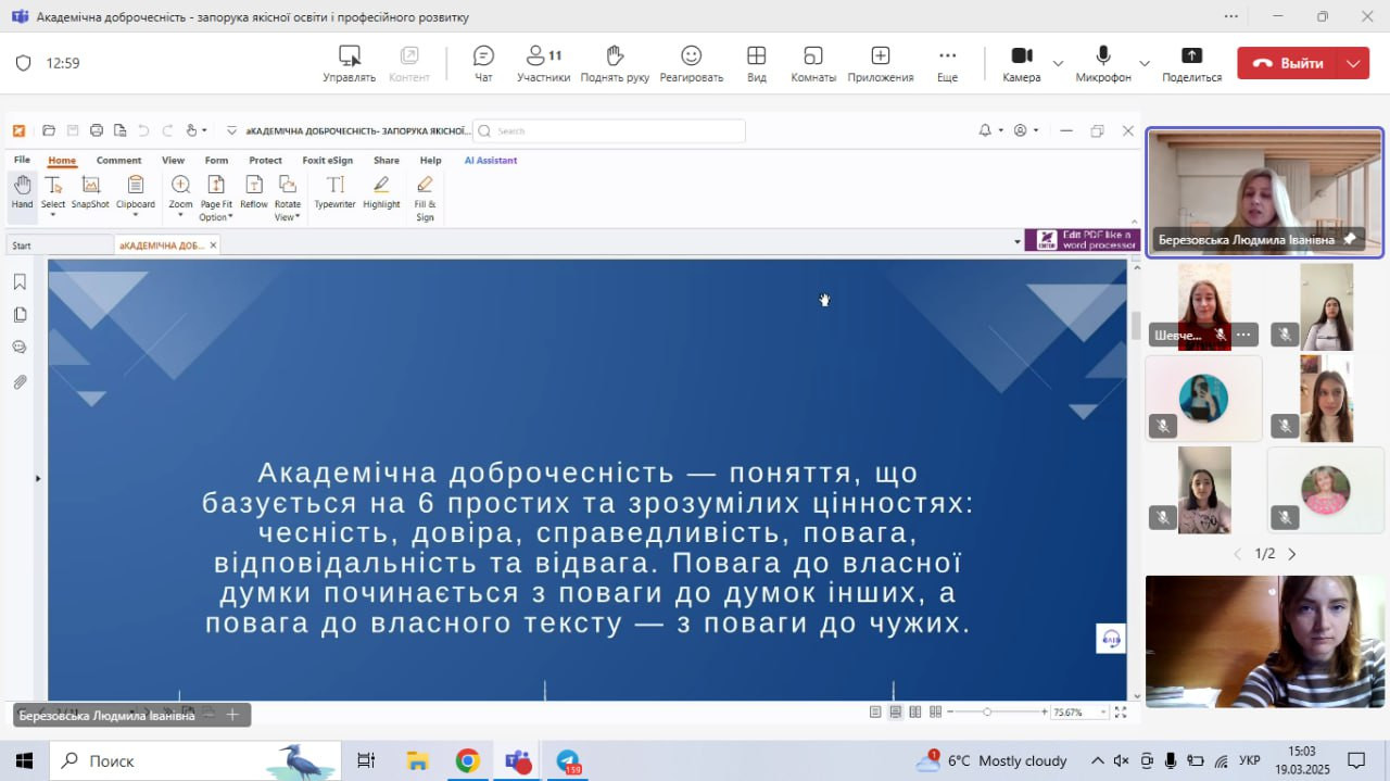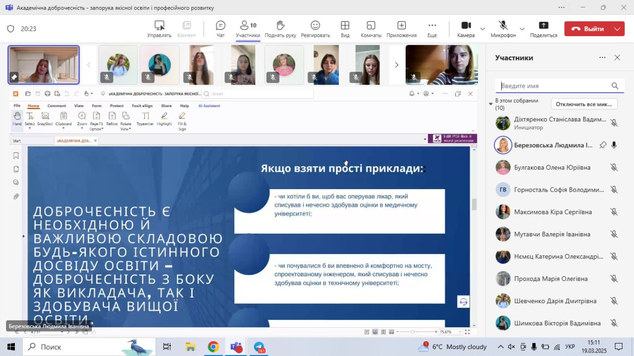 Викладач-стажист кафедри теорії та методики дошкільної освіти Станіслава Діхтяренко звернула увагу здобувачів освіти на необхідності самостійного виконання завдань, підкресливши значення критичного мислення у процесі опрацювання інформації, наголосила на відповідальності кожного студента за власні освітні досягнення, зазначивши, що «доброчесний підхід до навчання формує не лише професійну компетентність, а й сприяє розвитку особистісних якостей, необхідних для майбутньої педагогічної діяльності».