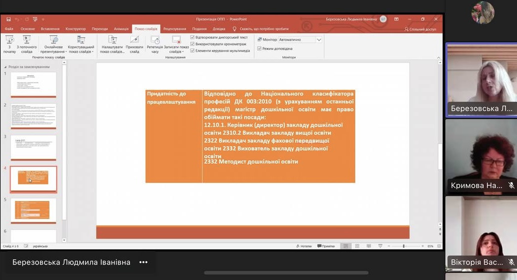Учасники зустрічі проаналізували актуальність цілей і результатів навчання, відповідність освітнього контенту сучасним вимогам професійної підготовки фахівців дошкільної освіти, надали практичні рекомендації щодо вдосконалення змістових модулів програми, з урахуванням новітніх тенденцій у галузі дошкільної освіти.
