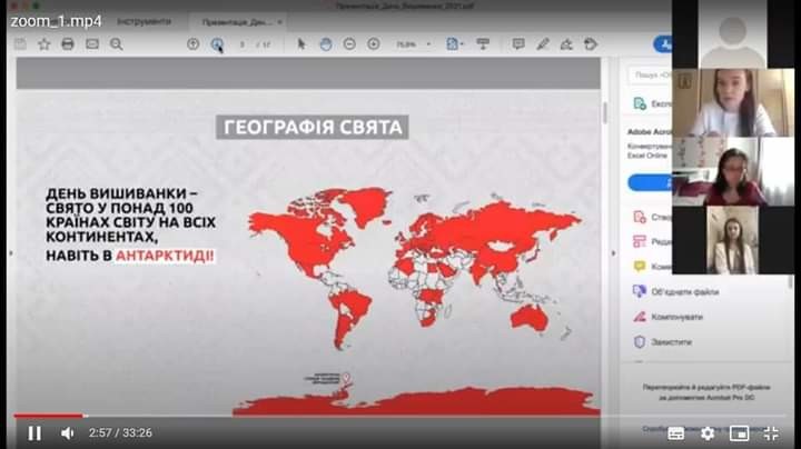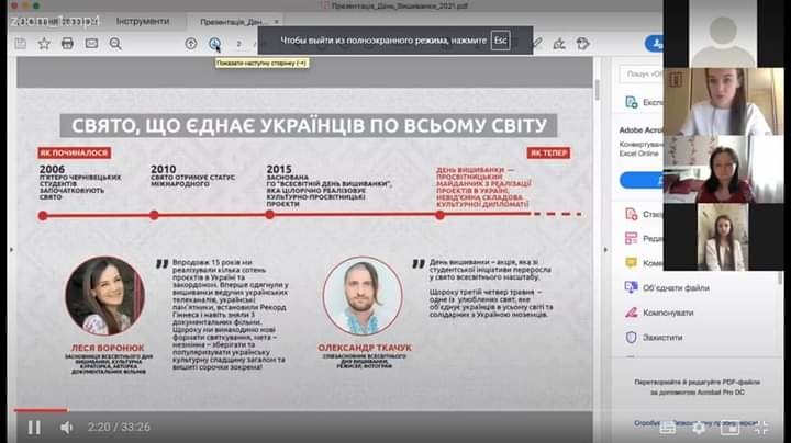 Напередодні дня Вишиванки в межах викладання навчальної дисципліни "Методика викладання дітей з українським народознавством в закладах дошкільної освіти" доктором педагогічних наук, доцентом кафедри теорії і методики дошкільної освіти Юлією Руденко було організовано онлайн-зустріч з засновницею свята Вишиванки в Україні -Лесею Воронюк. На зустрічі були присутні студенти факультету дошкільної педагогіки і психології 1-4 курсів. Пані Олеся розповіла студентам про історію зародження свята "День Вишиванки", зокрема про те, як святкується це свято в Українській діаспорі по всьому світу.