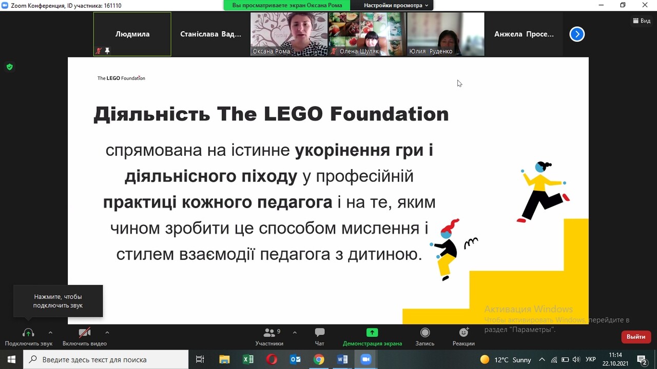 22 жовтня 2021 р. з ініціативи Оксани Кузнєцової – завідувачки кафедри дошкільної і початкової освіти КЗВО «Одеська академія неперервної освіти Одеської обласної ради» відбулася зустріч викладачів кафедри теорії і методики дошкільної освіти та кафедри сімейної та спеціальної педагогіки і психології факультету дошкільної педагогіки та психології з керівницею освітніх ініціатив The LEGO Foundation в Україні, Оксаною Ромою. Пані Оксана ознайомила учасників зустрічі з діяльністю The LEGO Foundation в Україні. Метою програми є формування професійних компетентностей майбутніх педагогів, сприяння їх професійному розвитку щодо застосування ігрових та діяльнісних методів навчання і розвитку в умовах Нової української школи та реалізації оновленого базового компоненту дошкільної освіти. У рамках зустрічі обговорено умови співпраці та імплементацію спецкурсів та навчальних дисциплін в освітній процес підготовки студентів, майбутніх вихователів ЗДО, програми підвищення кваліфікації викладачів вищої школи зі спеціальності 012 «Дошкільна освіта».