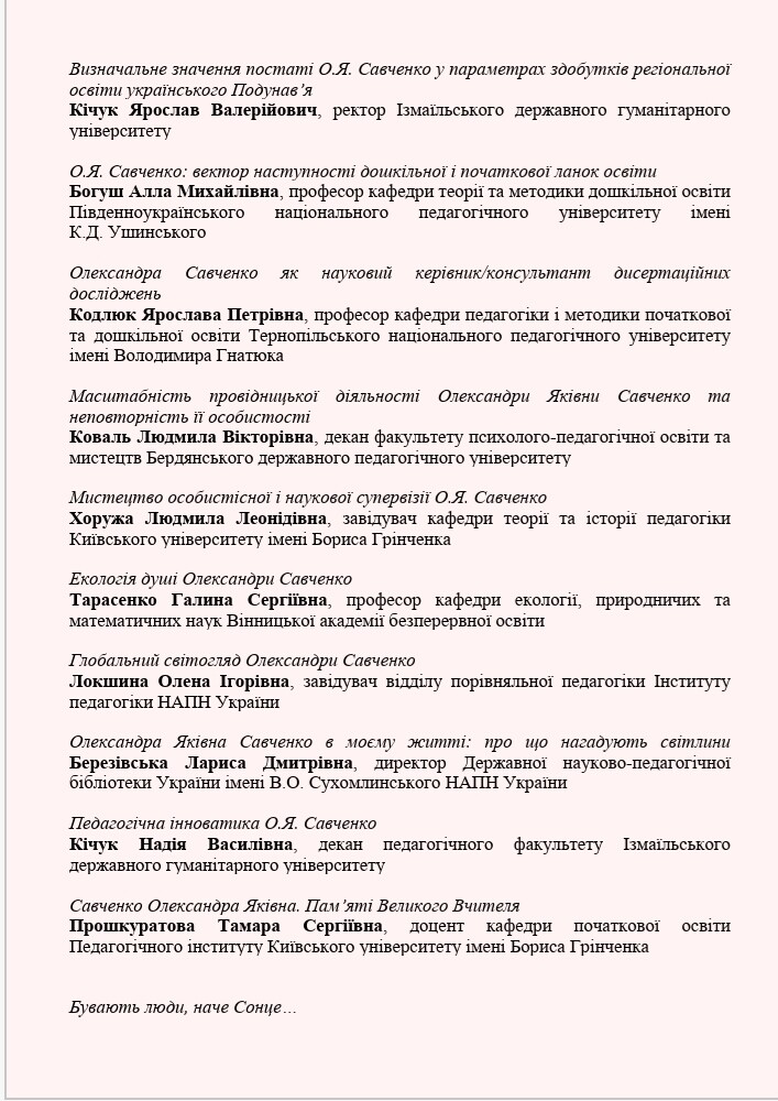 04 листопада 2021 р. в Національній академії педагогічних наук України відбулися І Всеукраїнські педагогічні читання, присвячені пам’яті Олександри Яківни Савченко. В роботі конференції взяла участь професор кафедри теорії і методики дошкільної освіти, академік НАПН України Алла Богуш.