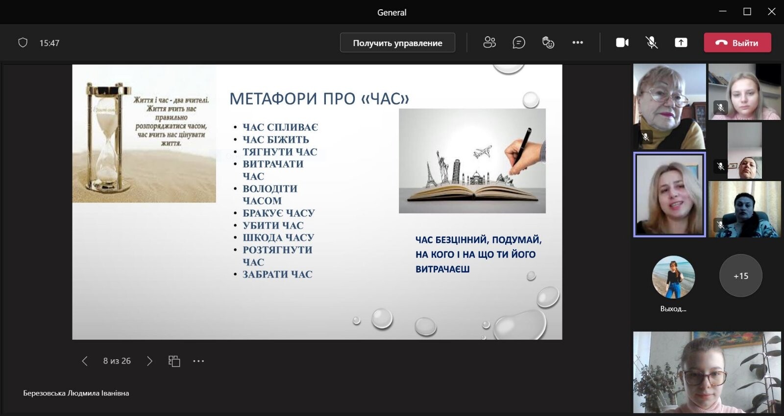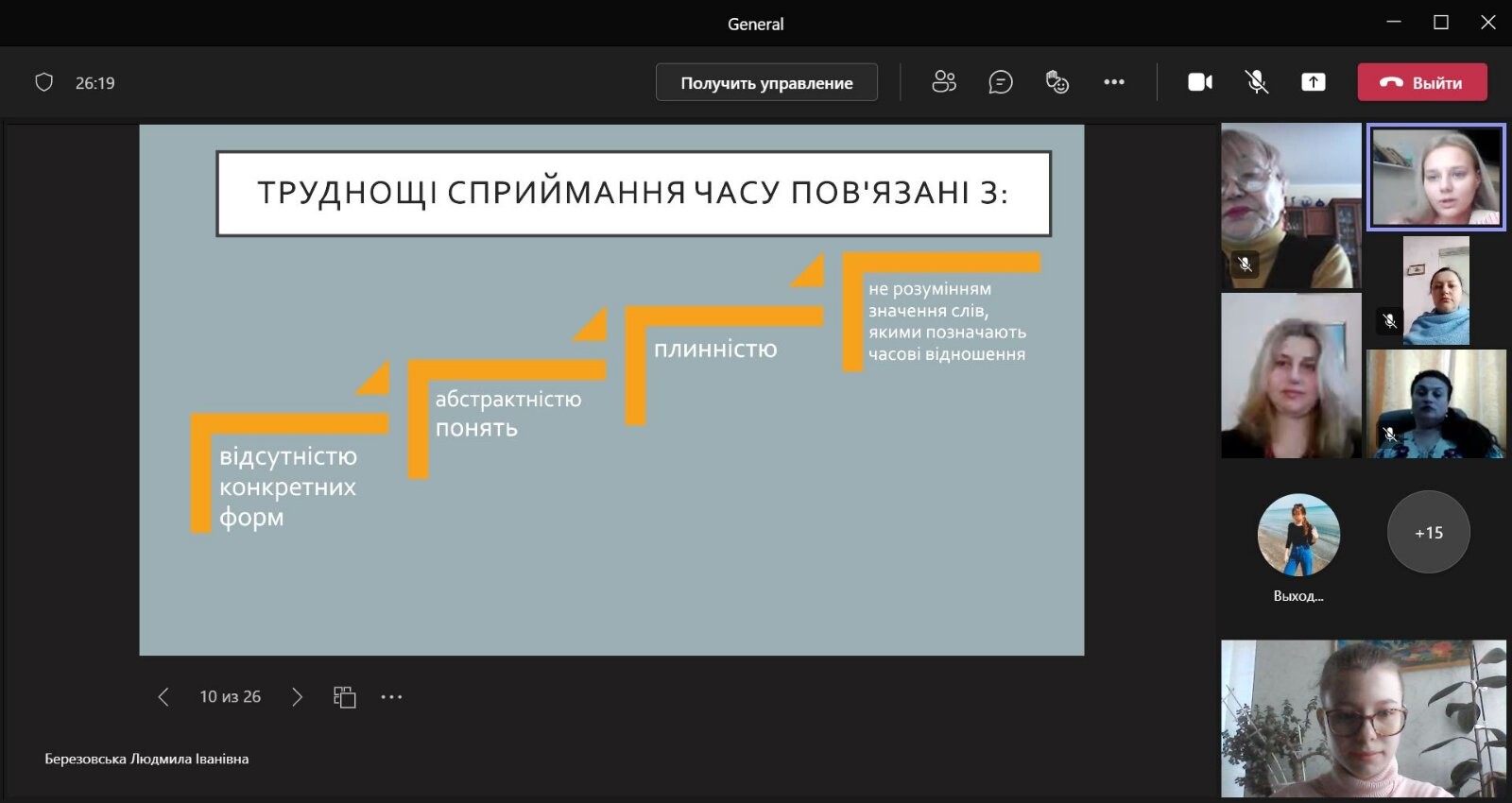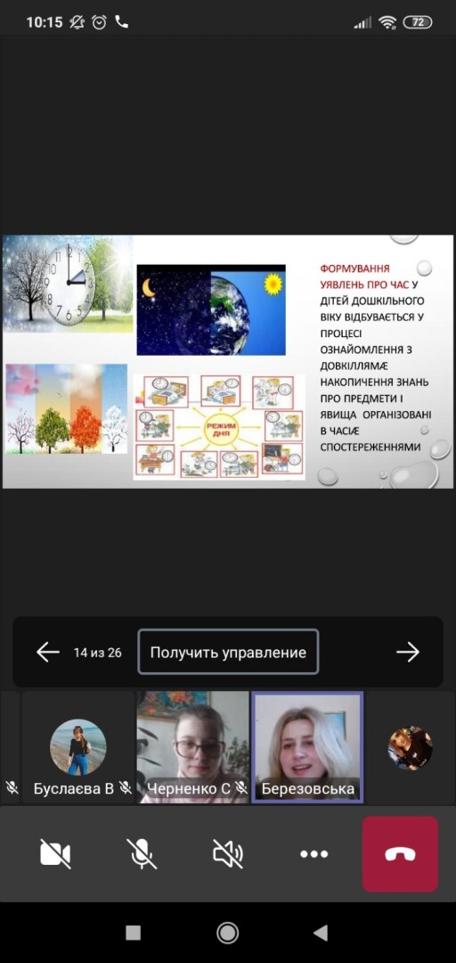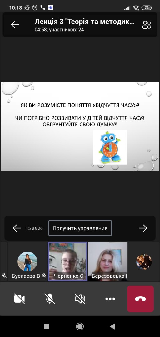 Лекційне заняття проведено в онлайн форматі на платформі Microsoft Teams відповідно до тематичного плану робочої навчальної програми дисципліни. Лекція носила проблемний характер. Матеріал лекції чітко структурований, зміст теми відповідав поставленій меті. Людмила Березовська вміло працювала з аудиторією, зацікавлюючи та підтримуючи увагу студентів. На занятті успішно реалізовані практичні, розвиваючі, освітні та виховні завдання. Організовані викладачем діалоги та проблемний виклад матеріалу лекції сприяли активізації пізнавальної діяльності здобувачів освітнього процесу. Л. Березовська влучно підібрала презентаційний матеріал щодо ознайомлення студентів з поняттям «час», «година», «хвилина», «доба», «ранок», «день», «вечір», «ніч», «календар», «дні тижня»; розкрила програмні завдання. Виклад лекційного матеріалу супроводжувався мультимедійною презентацією, що посилювало ефект сприйняття і засвоєння здобувачами освітнього матеріалу. Лекцію проведено з урахуванням сучасних освітніх вимог, нестандартна за формою та пізнавальна за змістом. Викладачі кафедри відзначили високий рівень професійної компетентності викладача, науковця, педагога.
