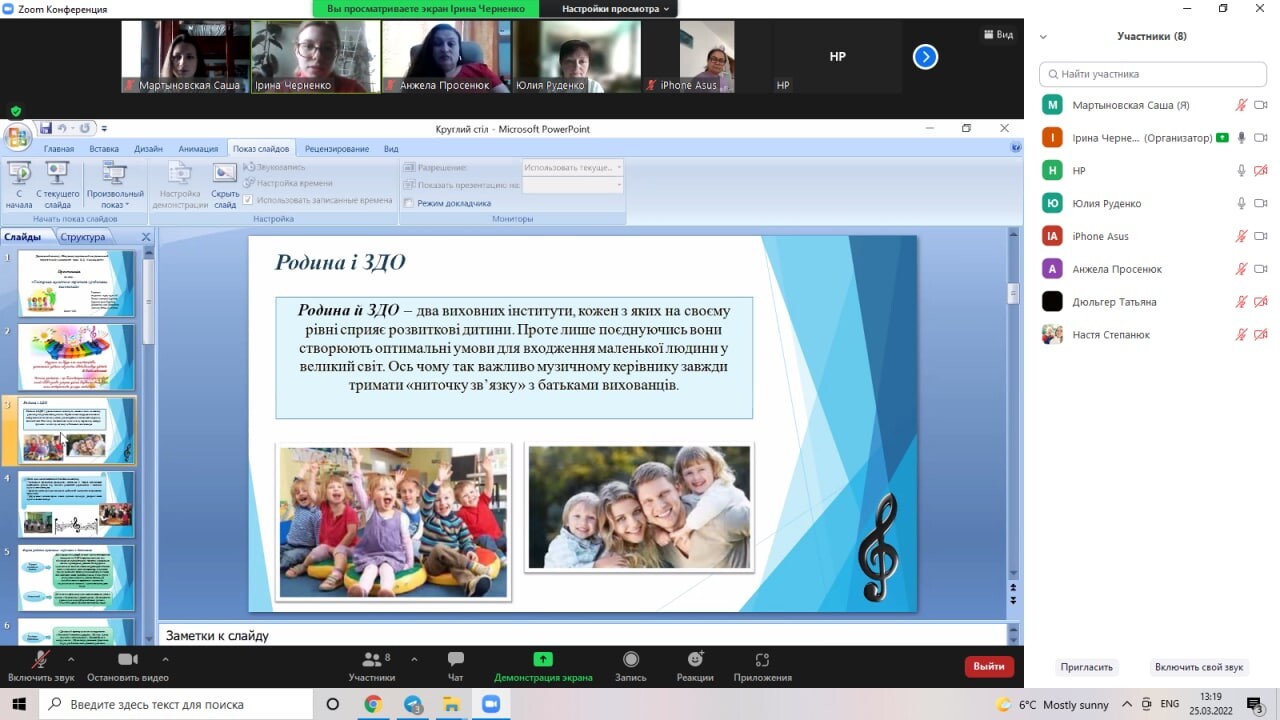 Відповідно до плану роботи науково-педагогічної лабораторії «Психолого-педагогічний супровід інноваційного викладання фахових методик дошкільної освіти» Анжелою Просенюк було проведено круглий стіл з теми «Співпраця ЗДО з родинами в естетичному вихованні дітей дошкільного віку».
