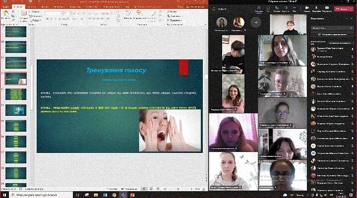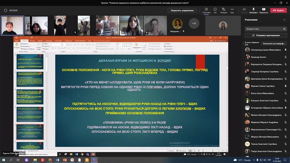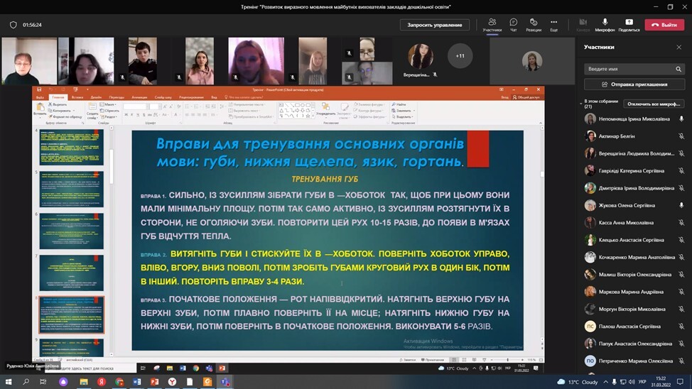 31 березня викладачами кафедри Ю. Руденко та І. Непомнящою був проведений онлайн тренінг «Розвиток виразного мовлення майбутніх вихователів закладів дошкільної освіти». У роботі тренінгу взяли участь здобувачі 3-го та 4-го року навчання спеціальності 012 Дошкільна освіта.