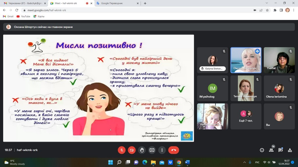 Тренером виступила  доктор психологічних наук, професор, голова Вінницького обласного відділення Української асоціації сімейних психологів, практикуючий психолог Оксана Миколаївна Шпортун. Говорили про позитивне та негативне. Освоїли техніку переривання неприємних думок.