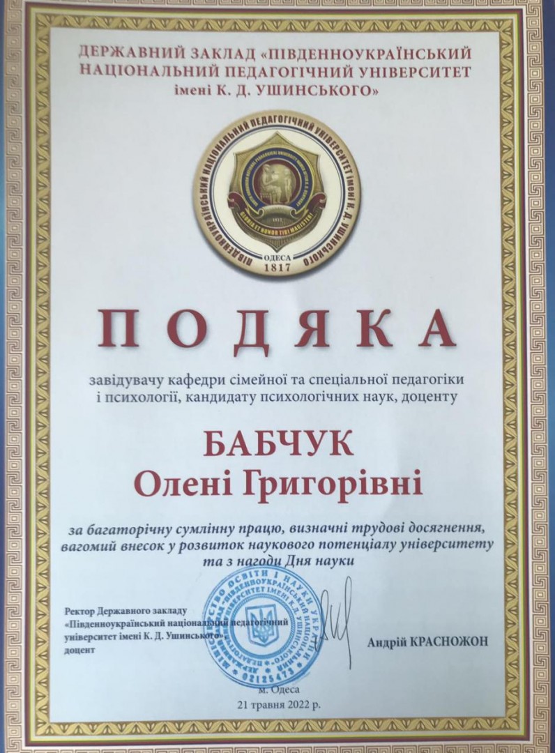 За багаторічну сумлінну працю, визначені трудові досягнення, вагомий внесок у розвиток наукового потенціалу університету та з нагоди Дня науки було нагороджено викладачів нашої кафедри, а саме: завідувача кафедри, кандидата психологічних наук, доцента Бабчук Олену Григоріївну та кандидата психологічних наук, доцента Кримову Наталію Олексіївну.