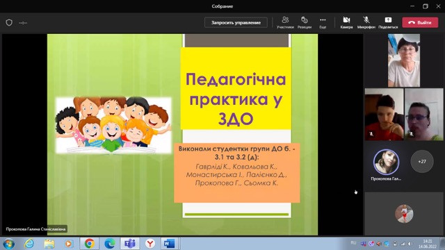 14 червня 2022 року в онлайн форматі на платформі Тeams відбулася звітна конференція за підсумками проходження здобувачами третього року навчання спеціальності 012 Дошкільна освіта, виробничої педагогічної практики в групах передшкільного віку. Студенти гідно представили результати своєї роботи відповідно до вимог програми практики. Звіти та підготовлені презентаційні матеріали практики засвідчили вміння здобувачів освітнього процесу використовувати набуті теоретичні знання у процесі безпосередньої практичної діяльності. Пишаємося нашими студентами та бажаємо подальших успіхів та нових професійних здобутків.