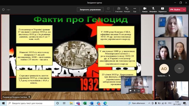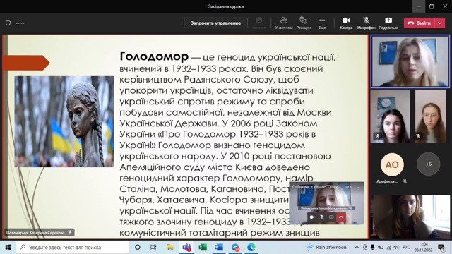 Під час заходу студенти-гуртківці переглянули презентацію «Голодомор 1932-1933 років – біль серця усієї України», порівняли її з подіями сьогодення. Ірина Попова наголосила на вагомості цієї пам’ятної дати, адже саме пам’ять та розуміння великої трагедії українського народу має велике значення для історії України. Вони не знищили нас у 1930-х роках, не знищать і у 2022 р.