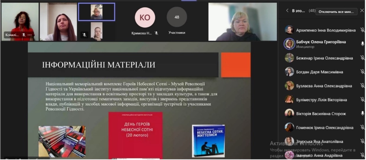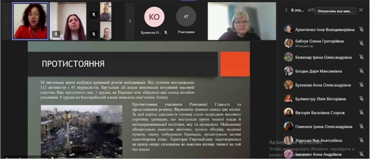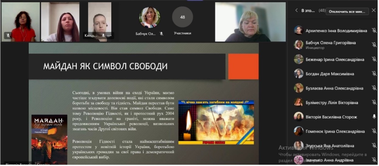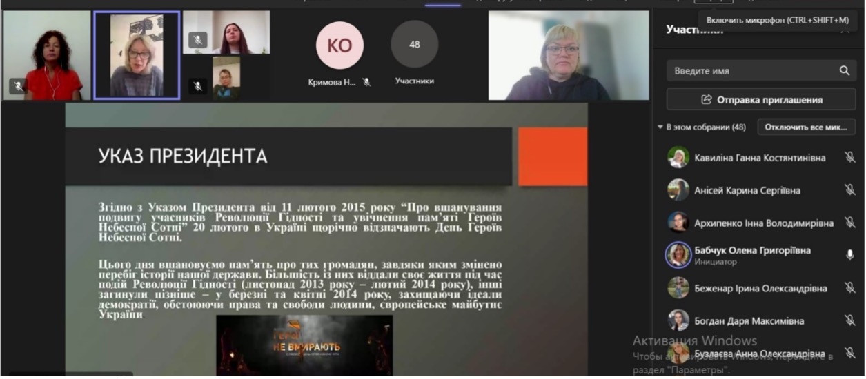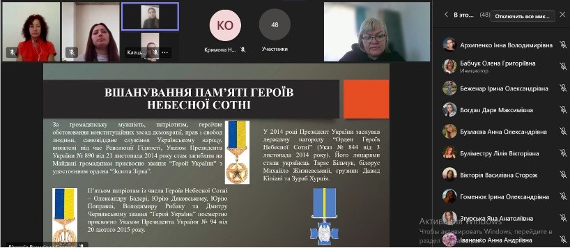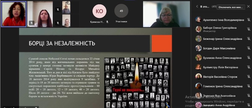 Завідувачка кафедри Олена Григоріївна Бабчук, доценти кафедри Вікторія Василівна Сторож, Вероніка Геннадіївна Ковиліна та здобувачка Маргарита Ігорівна Левицька підготували презентацію присвячену пам’яті та вшануванню Героїв Небесної Сотні.