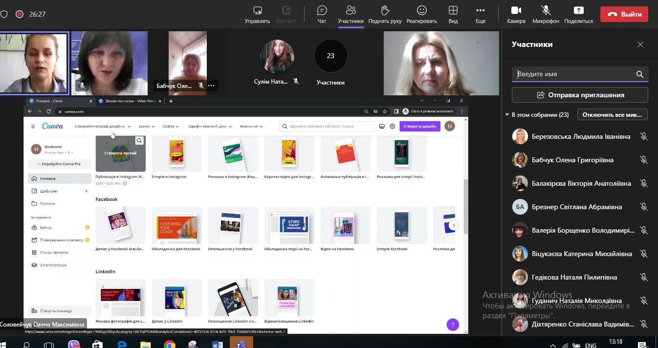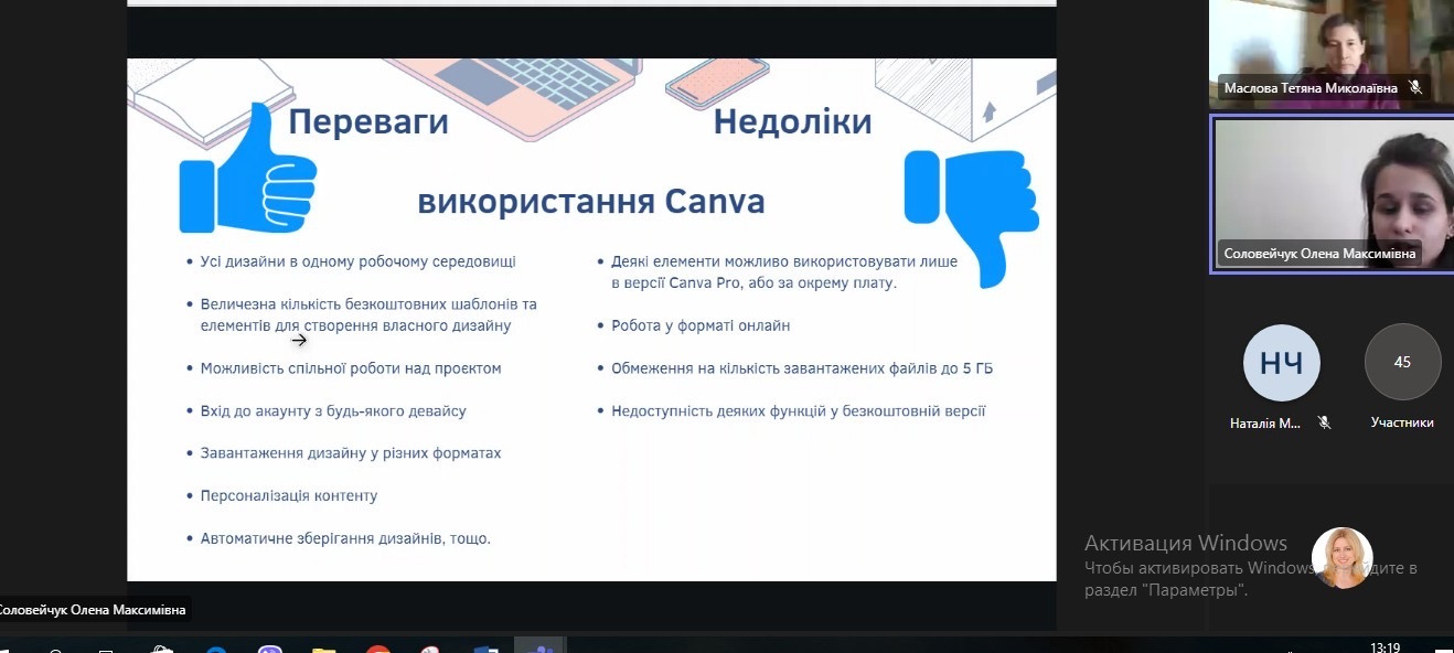 Фахівцем Центру, Оленою Соловейчук було презентовано інформацію про можливості використання онлайн-інструменту Canva у створенні графічного дизайну, презентацій, буклетів та іншого візуального контенту, який можливо використовувати як в освітньому процесі так і у соціальних мережах. Сервіс пропонує великий банк зображень, шрифтів, шаблонів та ілюстрацій, які практикували в процесі спільної роботи.