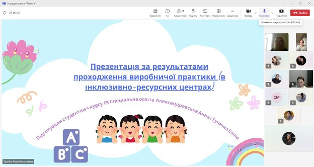4 березня 2025 року відбулася підсумкова конференція з виробничої практики (в інклюзивно-ресурсних центрах) здобувачів вищої освіти денної форми навчання першого (бакалаврського) рівня спеціальності Спеціальна освіта четвертого року навчання. Керівники практики, професор Г.Б. Соколова та доцент кафедри спеціальної та інклюзивної освіти і реабілітації В.І. Галущенко.