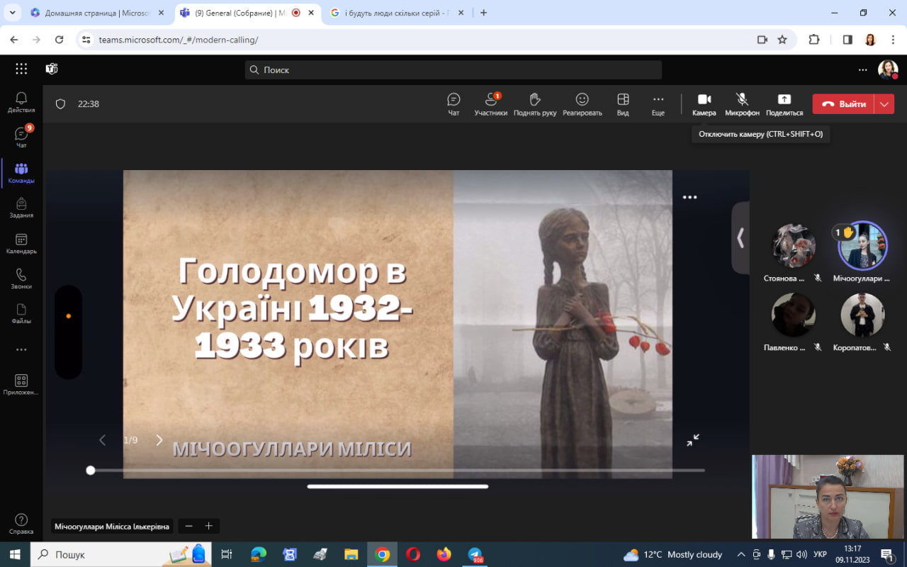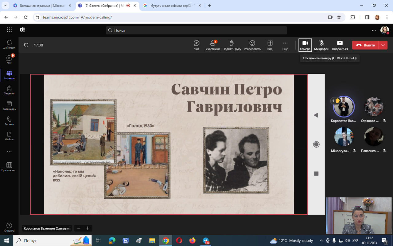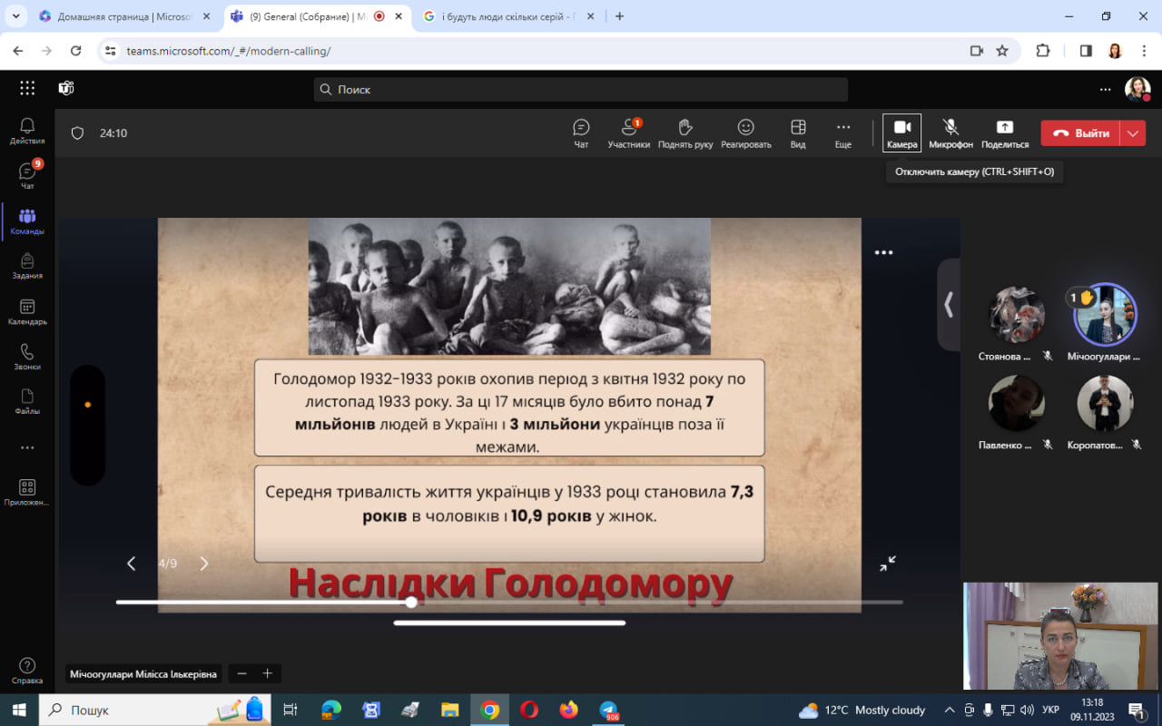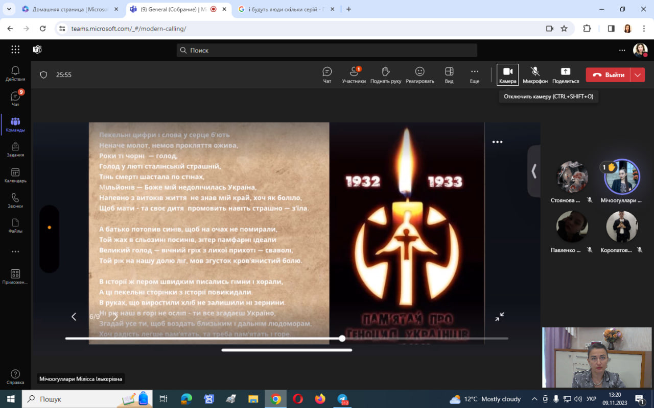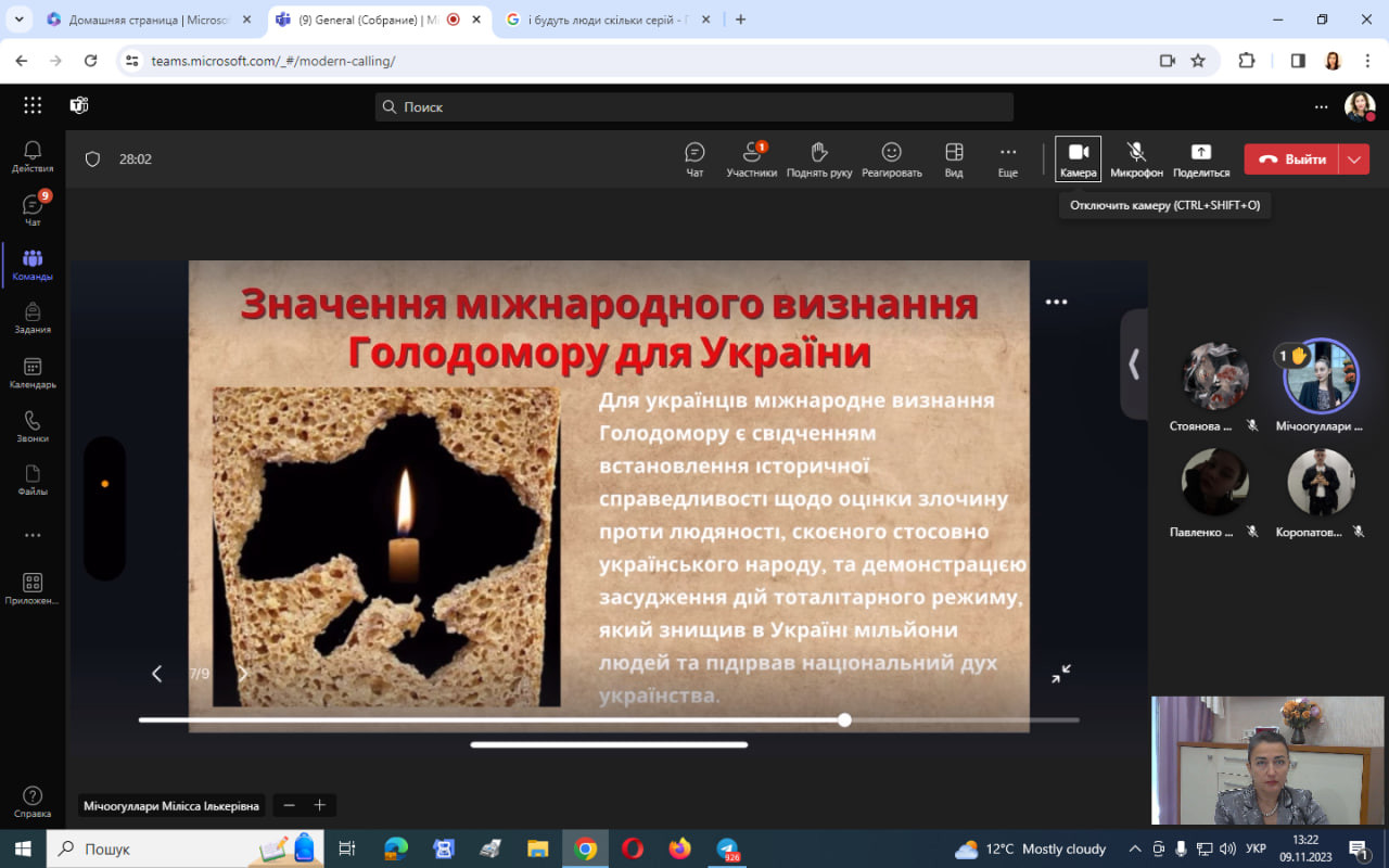 09 листопада 2023 року здобувачі першого (бакалаврського) рівня вищої освіти ОПП «Переклад», члени студентського наукового гуртка «Південноукраїнські наукові студії» (керівник – проф. Петінова О. Б.) провели зустріч, приурочену вшануванню пам’яті жертв голодомору. Студенти – Валентин Коропатов, Міліса Мічоогуллари, Валерія Павленко, Дар’я Стоянова та Чжан Чи підготували повідомлення про історичні факти цього страшного геноциду, а також розглянули та проаналізували твори мистецтва й художньої літератури, в яких відображена ця трагічна сторінка історії нашого народу. Надзвичайна біль… Пам’ятаємо… Сумуємо… Шануємо...