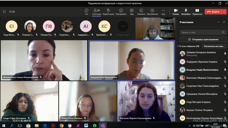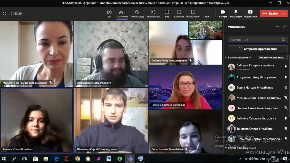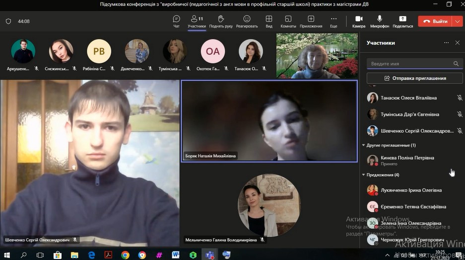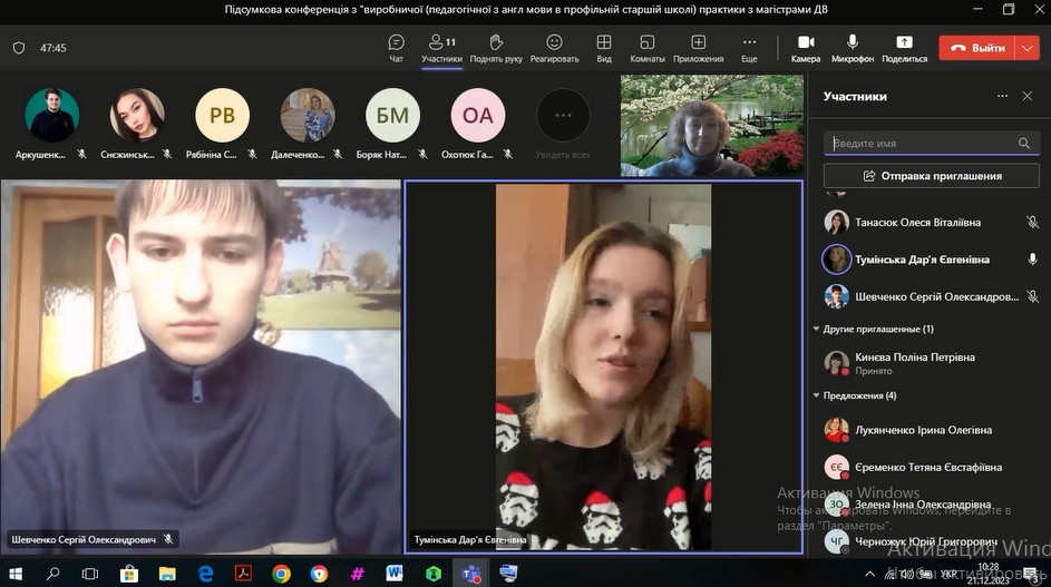 14 та 21 грудня були проведені підсумкові конференції з виробничої (педагогічної з англійської мови та зарубіжної літератури в профільній школі) практики зі здобувачами вищої освіти заочного та денного відділення, за другим (магістерським) рівнем, 1 року навчання освітньо-професійної програми «Середня освіта (Англійська мова і зарубіжна література)» за спеціальністю 014.02 «Середня освіта (Мова і зарубіжна література (англійська))».