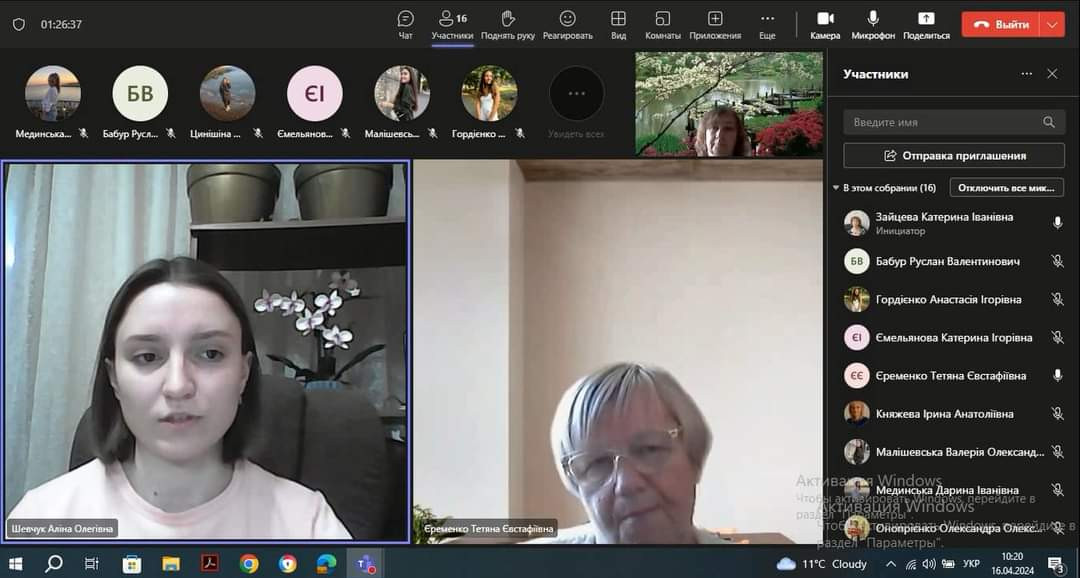 16 квітня провели зі здобувачами вищої освіти 4 року навчання ДВ та ЗВ підсумкову конференцію з виробничої (педагогічної з англійської мови у середній школі) практики освітньо-професійної програми «Середня освіта (Мова і література (англійська))» за спеціальністю 014 Середня освіта (Мова і література (англійська)), яка тривала два місяця.На конференції були присутні керівник з педагогіки, професор кафедри педагогіки Княжева І.А. та члени комісії доцент кафедри германської філології та МВІМ Жаборюк І.А. та завідувач кафеди, професор Єременко Т.Є.