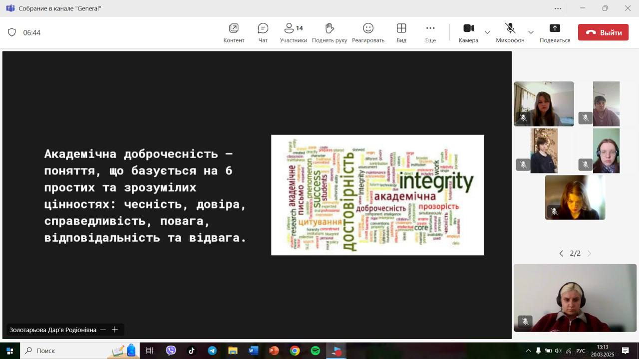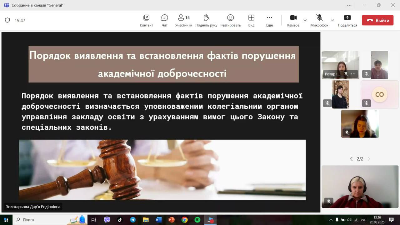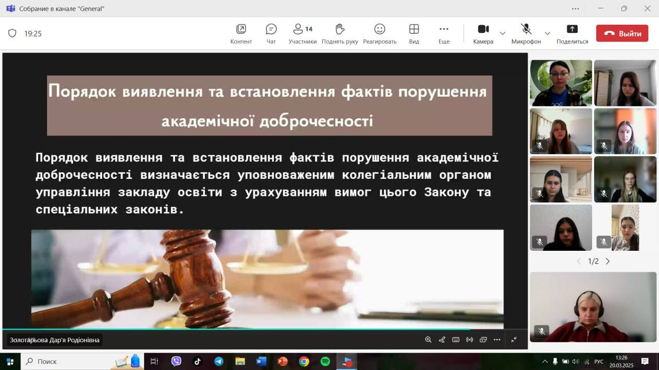 Студенти були ознайомлені з основними принципами доброчесності, з видами порушень академічної доброчесності, а також з наслідками недотримання академічної доброчесності.