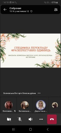 11 квітня 2025 року відбулося засідання проблемної групи «Актуальні проблеми сучасного перекладознавства» під керівництвом д.філол.н., доц. Світлани ЛЮБИМОВОЇ. У засіданні взяли участь завідувачка кафедри перекладу і теоретичної та прикладної лінгвістики Ілона ДЕРІК, здобувачі вищої освіти третього і четвертого курсів першого (бакалаврського) рівня, лауреати конкурсу студентських наукових робіт Юлія КУДЛАЙ та Ірина ШПИТКО та учасники ХІ Міжнародної конференції «Актуальні проблеми філології і професійної підготовки фахівців у полікультурному просторі» Анна ІЩЕНКО, Елеонора ПОПОВИЧ та Вікторія БЄЛЯЄВСЬКА.