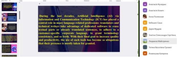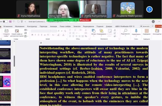 22 травня 2025 року на запрошення ректора Національного університету «Одеська політехніка» у межах програми внутрішньої академічної мобільності «Гостьовий лектор» відбулась гостьова лекція завідувачки кафедри перекладу і теоретичної та прикладної лінгвістики к.філол.н., доцента Ілони ДЕРІК для здобувачів вищої освіти бакалаврського та магістерського рівнів, що навчаються за спеціальністю В11«Філологія» за ОПП «Переклад» на тему “Artificial Intelligence in Translation”.Лекцію було представлено англійською мовою. Актуальність тематики було підтверджено зацікавленістю здобувачів вищої освіти, яку вони продемонстрували, поставивши багато цікавих запитань. Лекцію також відвідала в.о. завідувачки кафедри англійської філології та перекладу Румянцева Олена Анатоліївна та науково-педагогічні працівники кафедри, зокрема д.філол.н., проф. Тетяна ГРОМКО та к.філол.н., доц. Людмила МАЙСТРЕНКО. У подальшому плануються гостьові лекції як науково-педагогічних працівників кафедри перекладу і теоретичної та прикладної лінгвістики, зокрема д.філол.н.. проф. Олександра ІЛІАДІ та д.філол.н., доц. Світлани ЛЮБИМОВОЇ, так і науково-педагогічних працівників кафедри англійської філології та перекладу.