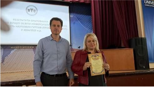 Також Дерік І.М. одержала Подяку від адміністрації Університету Ушинського за якісну підготовку переможця Всеукраїнського конкурсу студентських наукових робіт за напрямом «Філологія (Переклад)» у 2024/2025 навчальному році, Шпитко Ірини Мирославівни.