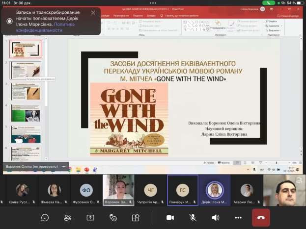 29.12. 2025 та 30.12.2025 на кафедрі перекладу і теоретичної та прикладної лінгвістики факультету іноземних мов відбулись захисти магістерських робіт випускників ОПП другого (магістерського) рівня «Переклад (перша- англійська, друга-німецька)» спеціальності 035 Філологія вступу 2024-2025 н.рр.денної та заочної форм здобуття освіти.